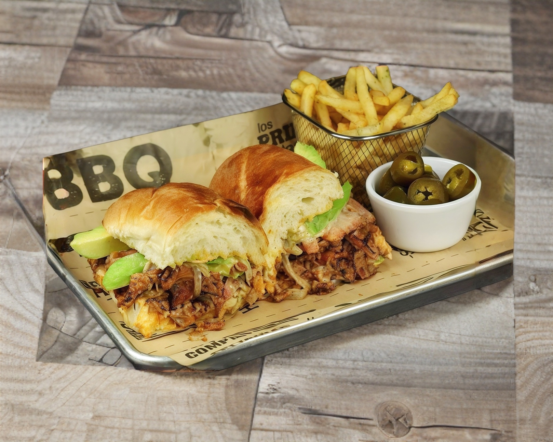 Pan baguette con brisket, mayonesa de la casa, salsa BBQ, tomate, cebolla, aguacate, acompañado de papas a la francesa, pepinillos y jalapeños.