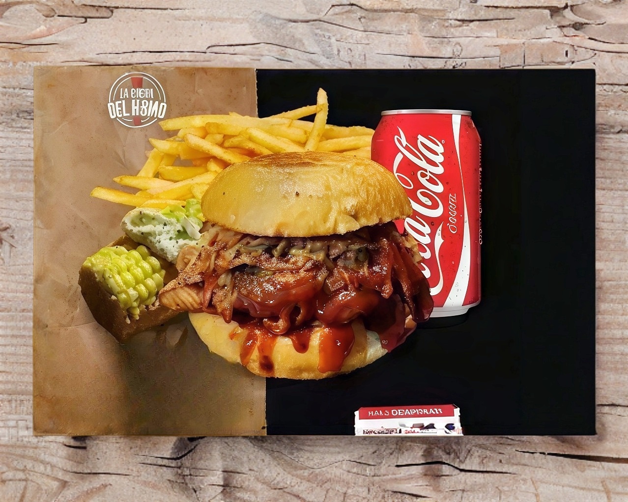 Sándwich de brisket ahumado, salsa BBQ, mayonesa de la casa, papas a la francesa, Coca cola lata 355 ml, jalapeños y pepinillos.
