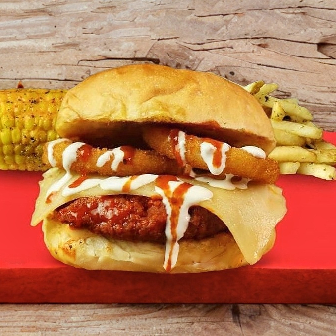 Sándwich de pollo empanizado en salsa búfalo, queso gratinado, salsa BBQ, mayonesa de la casa, papas a la francesa, elote amarillo aderezo de chipotle, jalapeños y pepinillos.