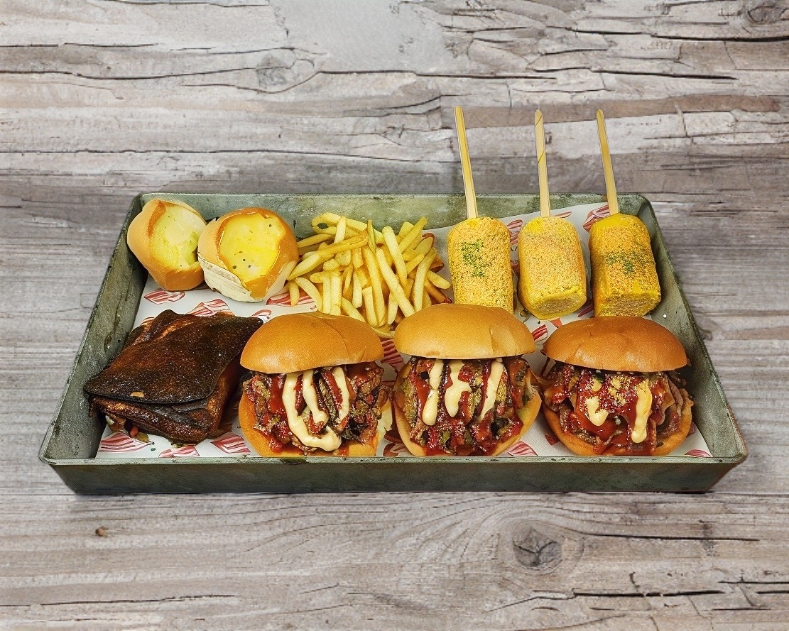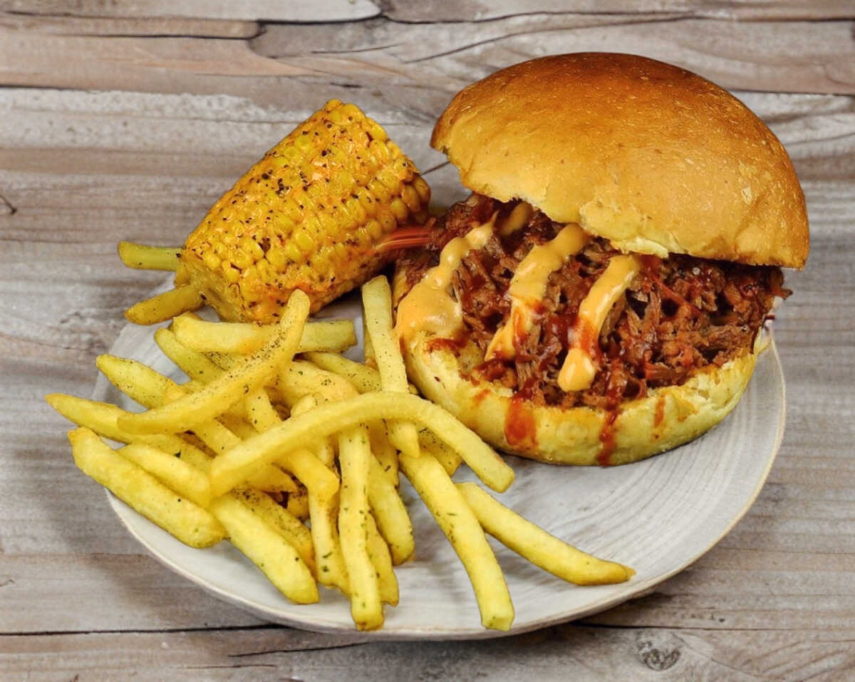.200 gr de brisket ahumado, salsa BBQ, pan con mantequilla, papas a ala francesa y elote amarillo con aderezo chipotle, pepinillos y jalapeños.