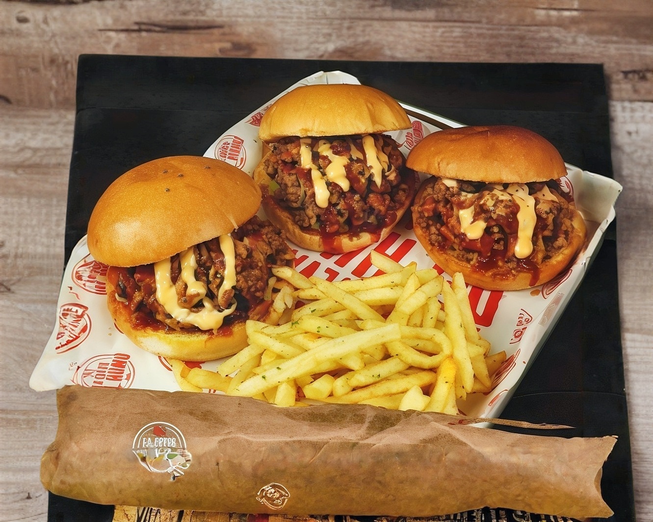 (3) sandwich de brisket ahumado, salsa BBQ, mayonesa de la casa, (3) papas a la francesa, jalapeños y pepinillos.