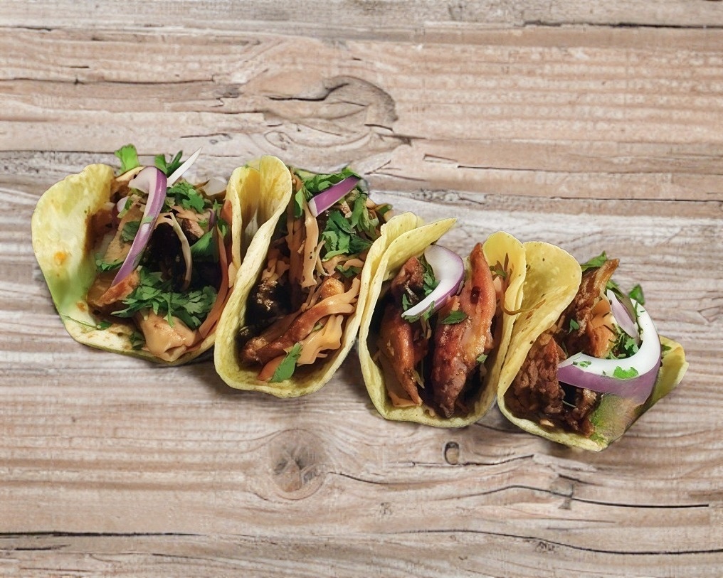 (4) tacos de Boston/Pulled Pork, ahumado, harina o maíz, cebolla, cilantro, salsa y limones