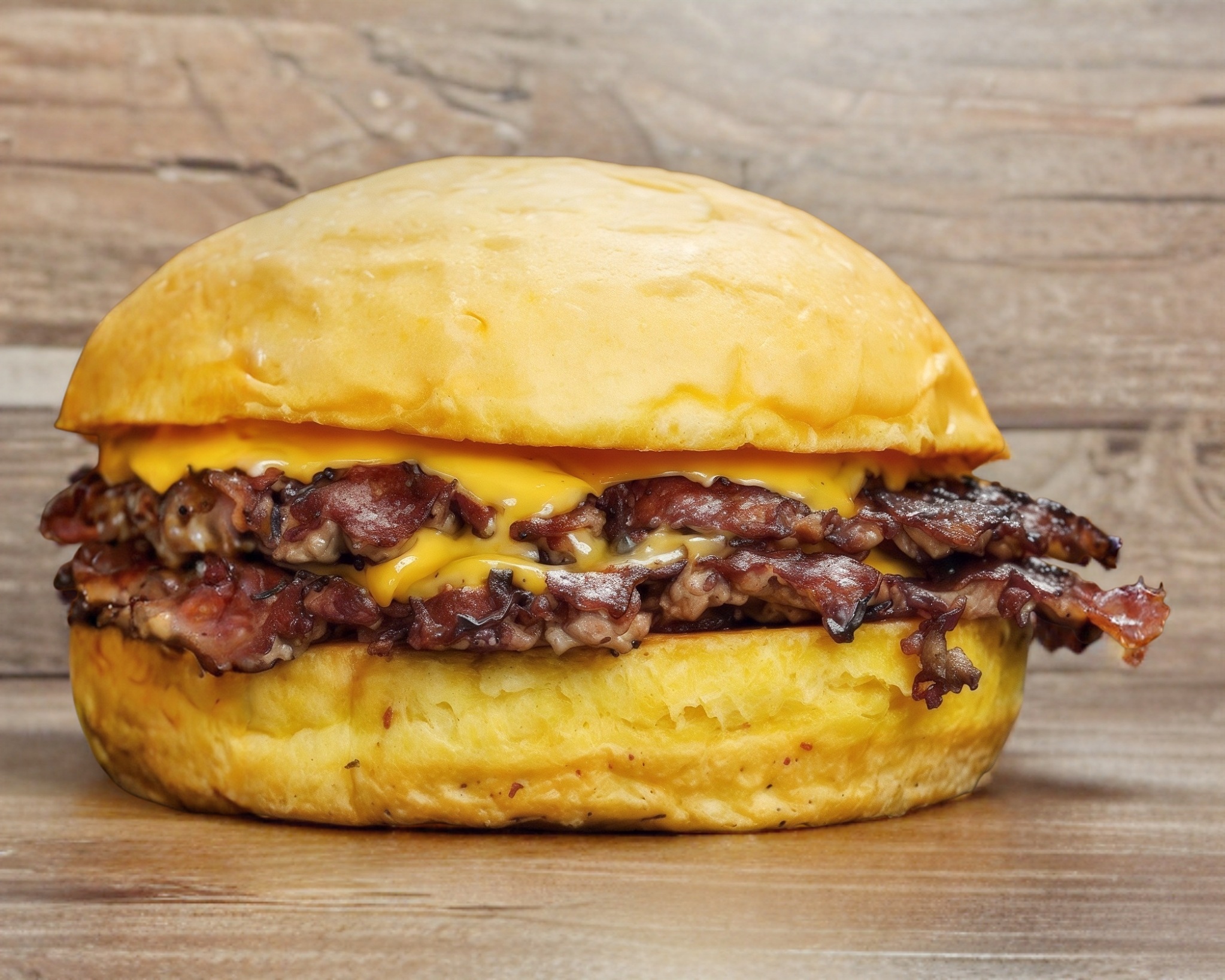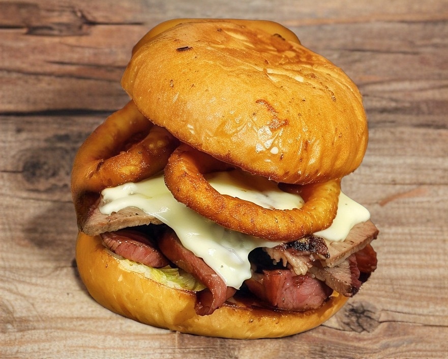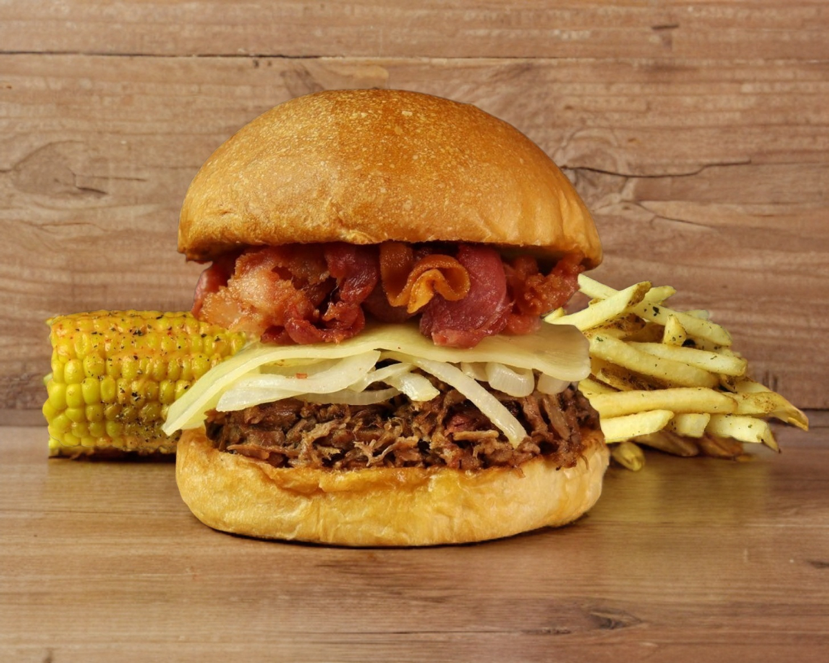 Sándwich de brisket ahumado, tocino queso gratinado, cebolla caramelizada salsa BBQ, mayonesa de la casa, papas a la francesa, elote amarillo aderezo de chipotle, jalapeños. y pepinillos.
