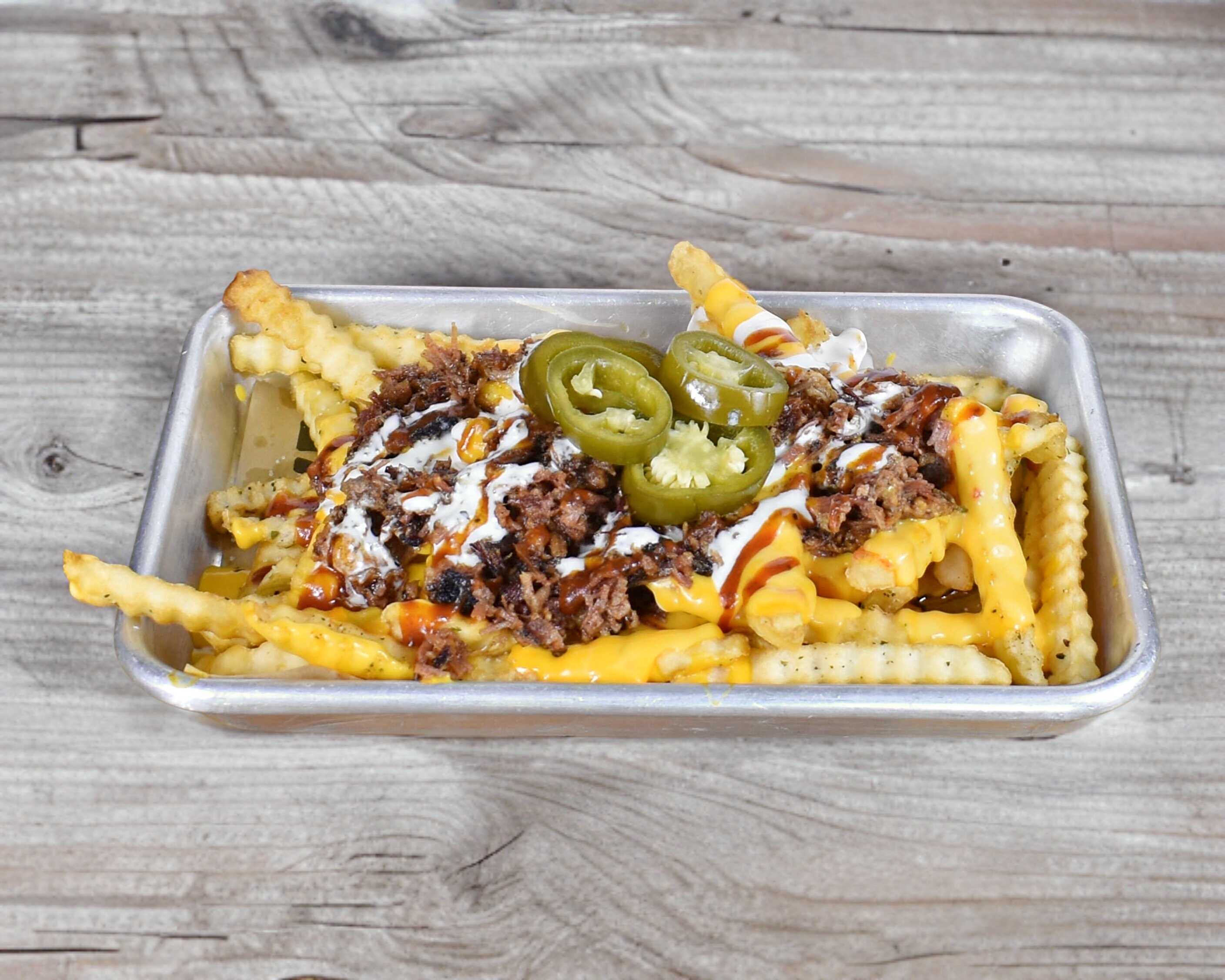 Papas a la francesa con queso amarillo, brisket, crema, salsa BBQ y jalapeños.