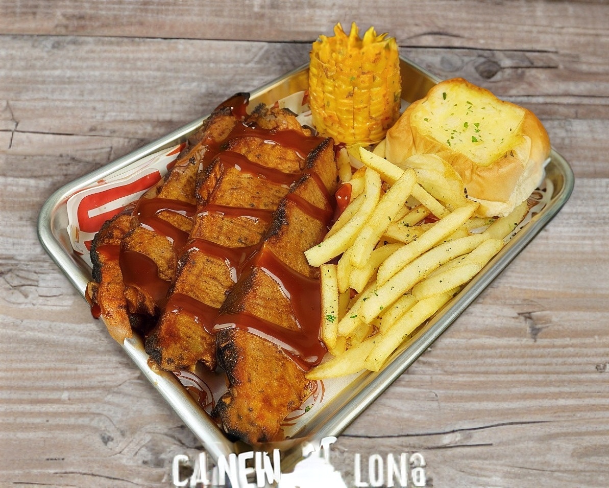 (3) costillas de puerco ahumadas, salsa BBQ, pan con mantequilla, papas a ala francesa y elote amarillo con aderezo chipotle, pepinillos y jalapeños.