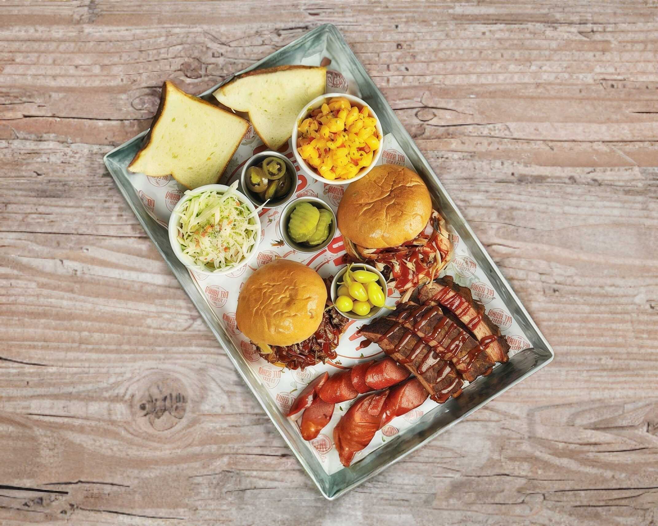 (3) brisket sandwich, (3) costillas de puerco, (3) papas a la francesa (3) elotes amarillos aderezo de chipotle, ensalada de col, pan con mantequilla, pepinillos y jalapeños.