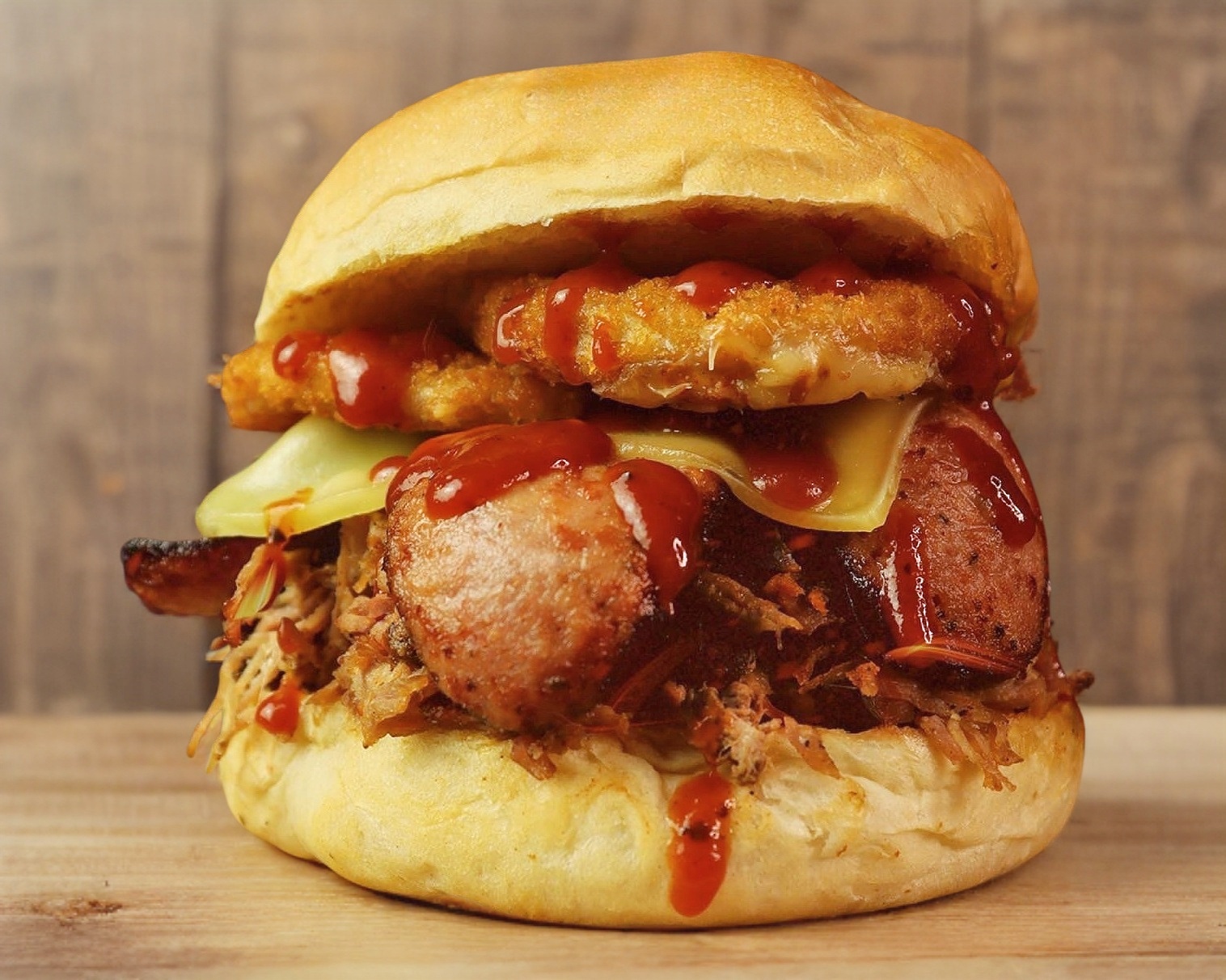 Sándwich de brisket ahumado, aros de cebolla, queso gratinado, salchicha polaca, salsa BBQ, mayonesa de la casa, papas a la francesa, elote amarillo aderezo de chipotle, jalapeños y pepinillos.