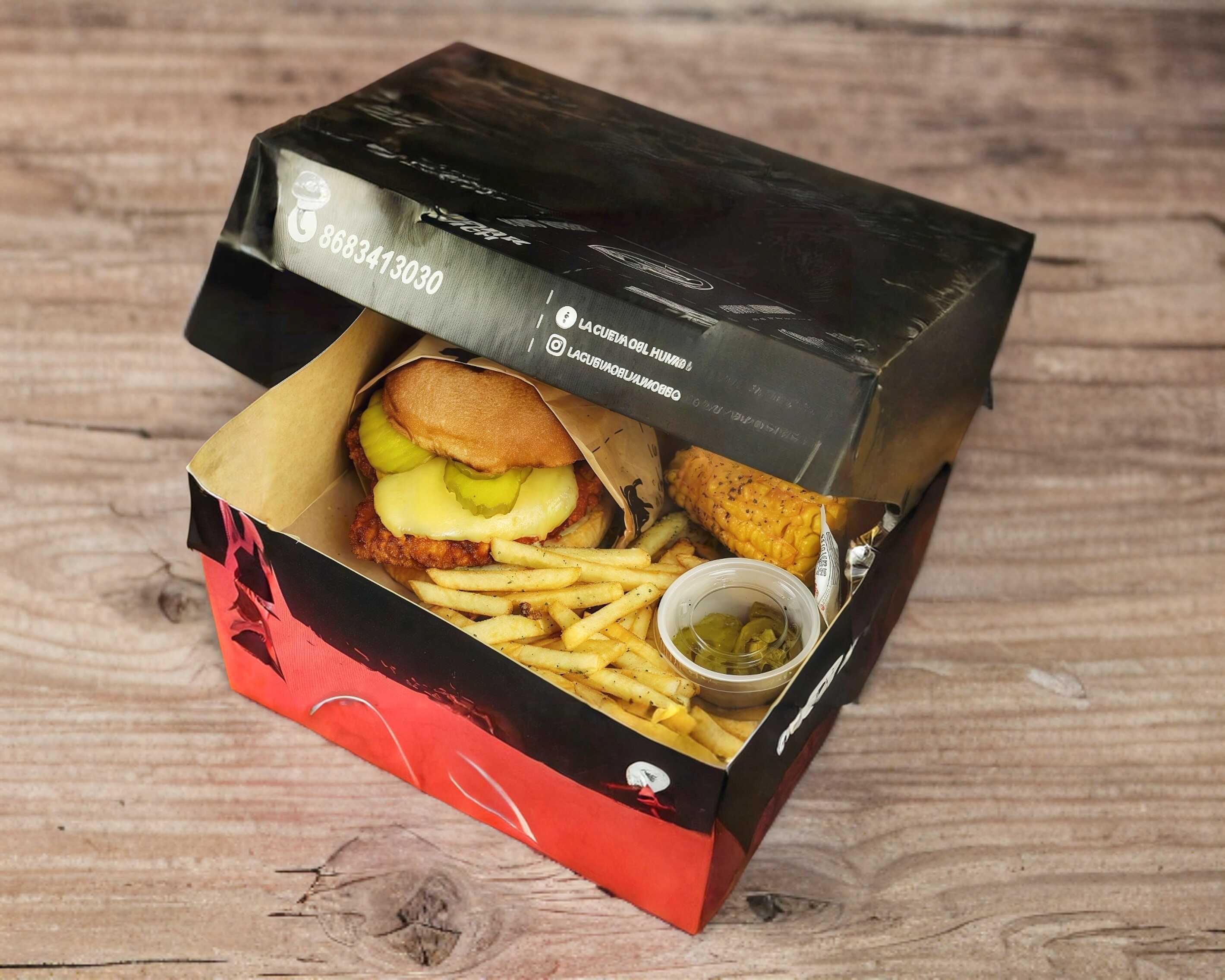 (4) sándwich de brisket ahumado, salsa BBQ, mayonesa de la casa, (4) papas a la francesa, (4) elotes amarillos aderezo de chipotle, jalapeños y pepinillos.