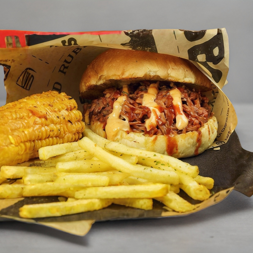 Sándwich Mixto de brisket y pulled pork ahumado, salsa BBQ, mayonesa de al casa, papas a la francesa, elote amarillo aderezo de chipotle, jalapeños y pepinillos.