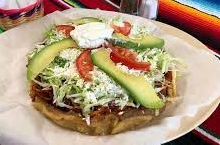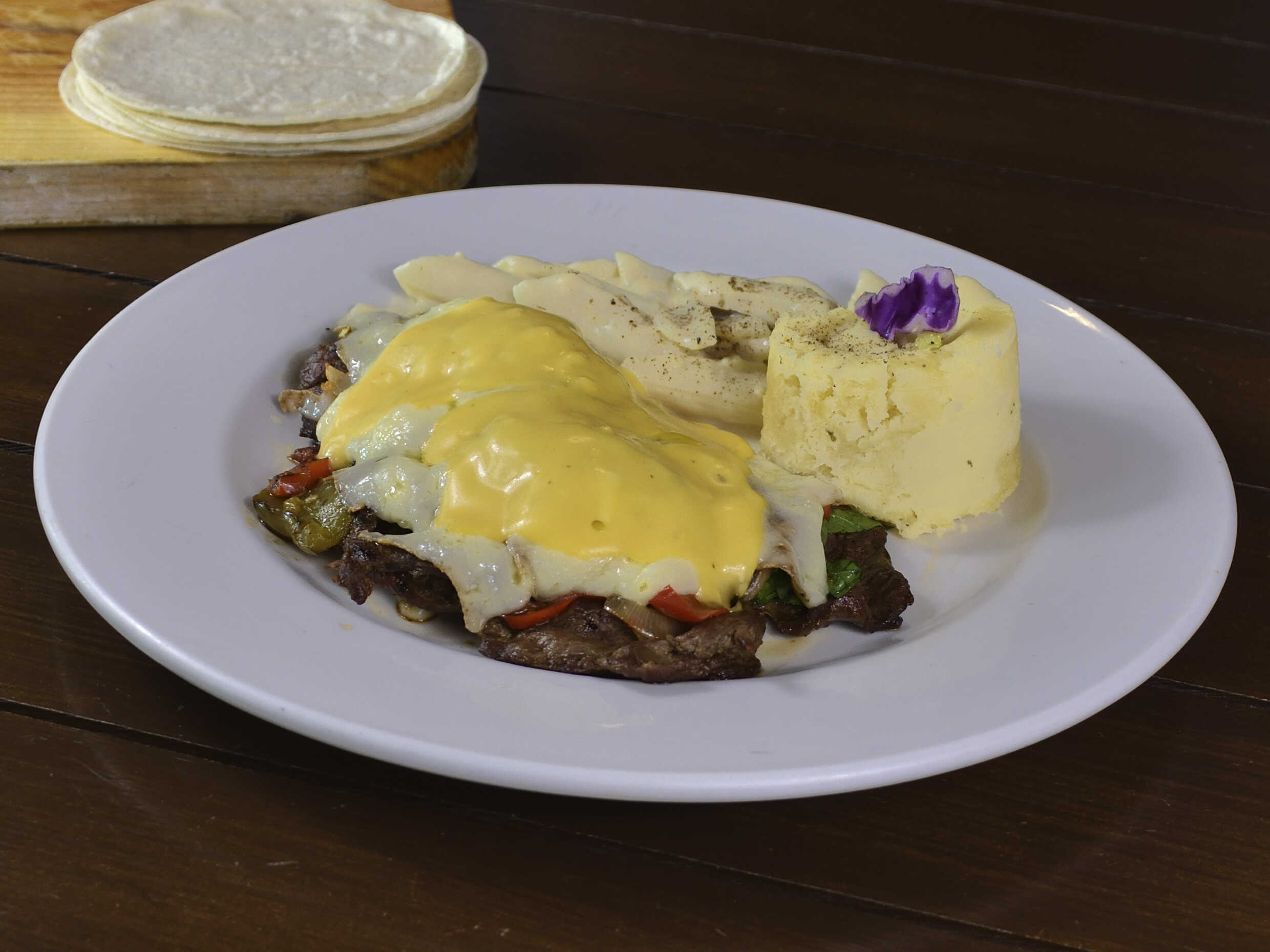 Tortilla d eharina frita en mantequilla, bistec, cebolla, chorizo, pimiento, queso y aguacate.