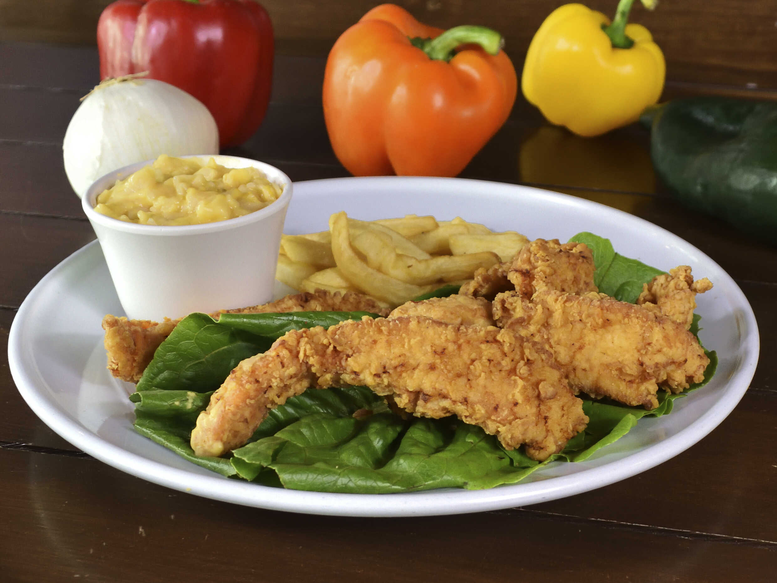 Pechuga de pollo empanizada, pimientos, champiñon, quesos, pepinillos, aderezo mostaza, papas fritas y jalapeños.
