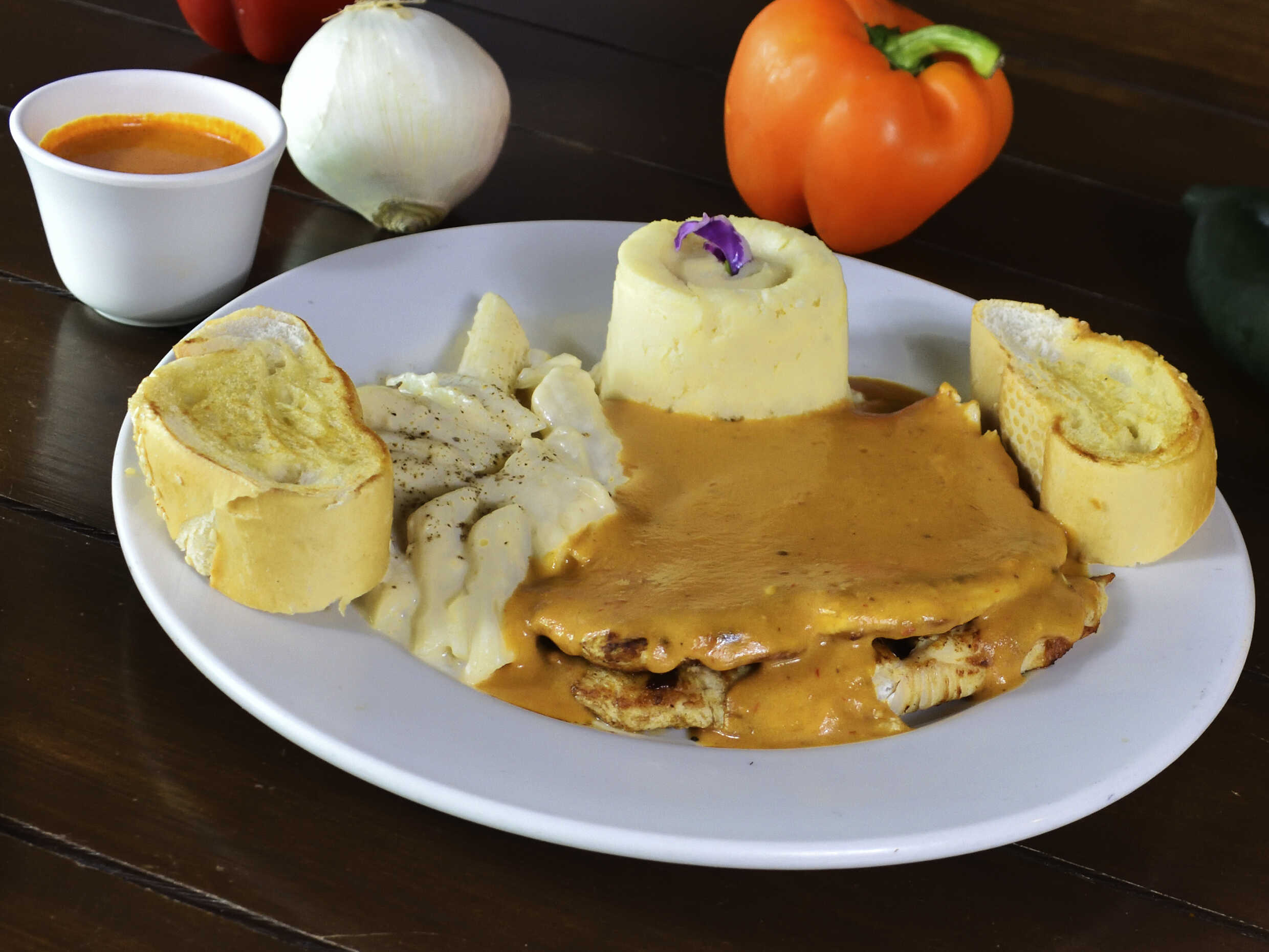 Pechuga a la plancha bañada en crema de chipotle acompañada de puré de papa, pasta y pan.