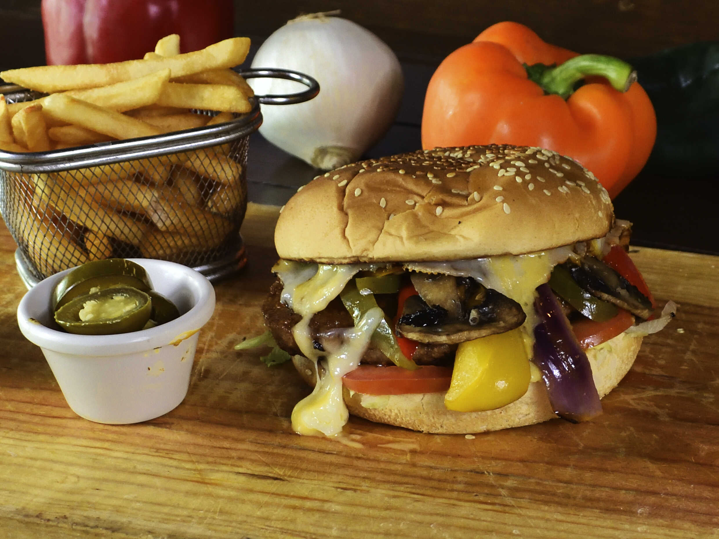 HAMBURGUESA DE SIRLOIN, LECHUGA, TOMATE, QUESOS, ADEREZOS, PIMIENTOS, CHAMPIÑONES, AGUACATE Y PIÑA, ACOMPAÑADA DE PAPAS FRITAS