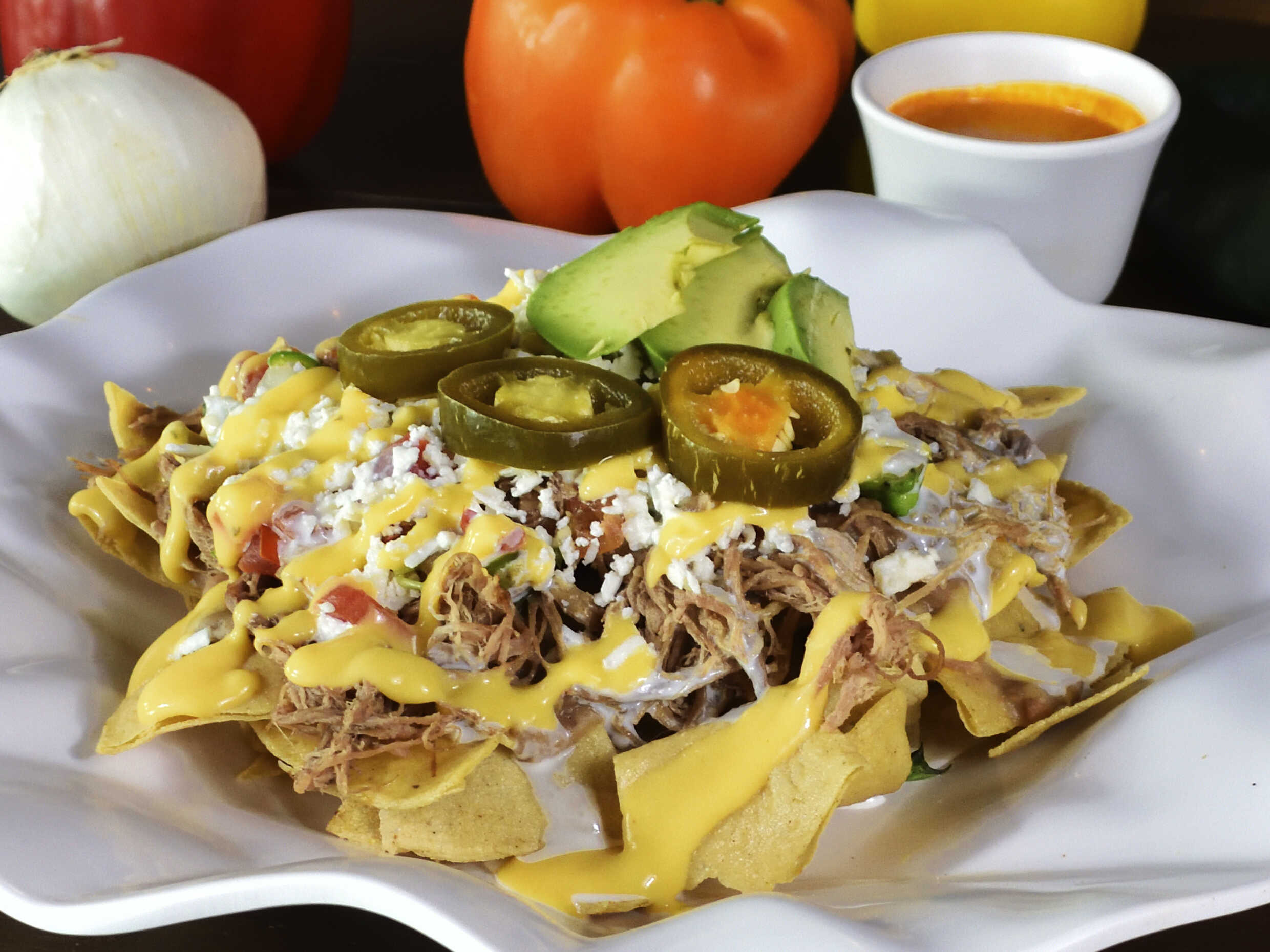 Cebolla, salchicha, bistec, pechuga, pimientos, quesos, papas fritas y jalapeños.