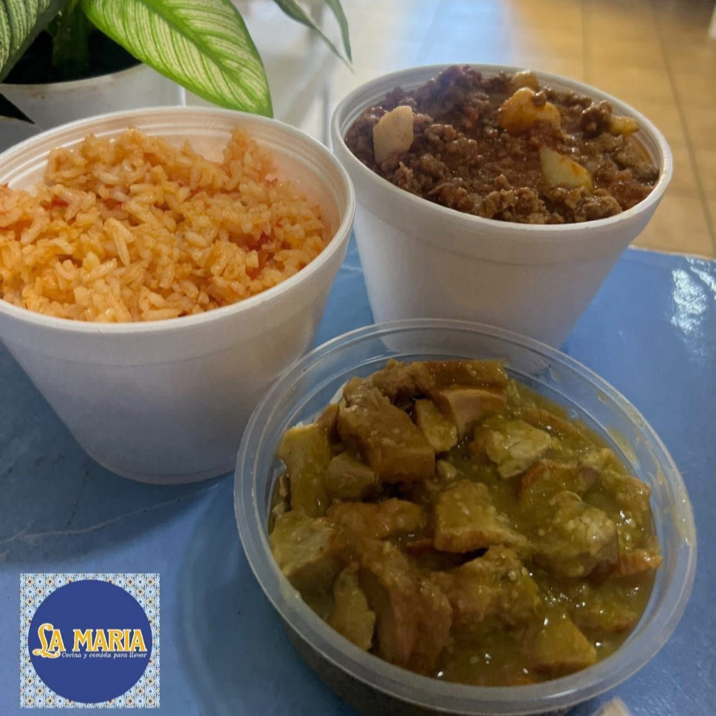 picadillo con papas acompanado de arroz y frijoles