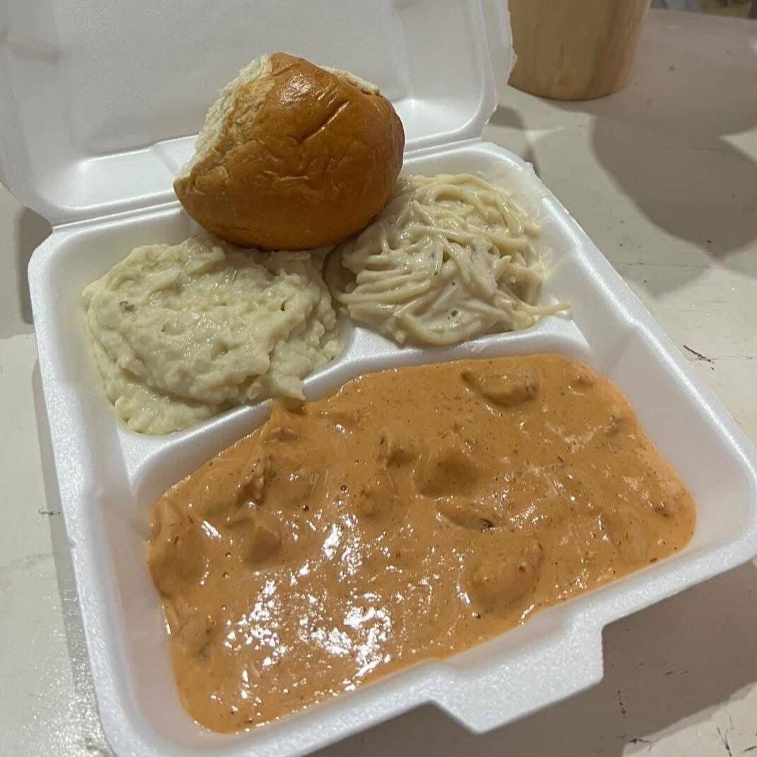 pollo en crema chipotle acompañado de pure de papa y spagueti blanco