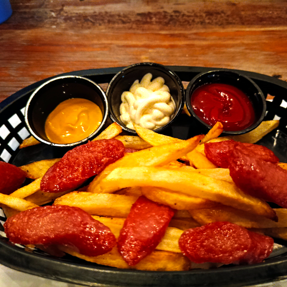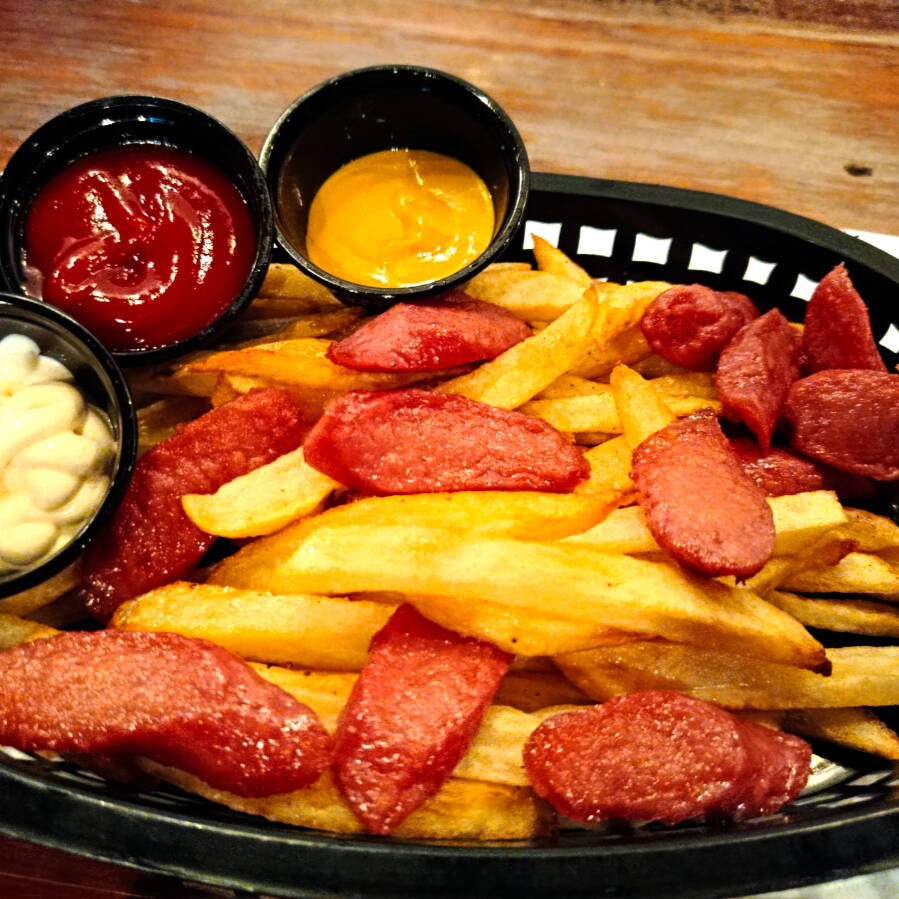 Papas fritas salchichas 3 aderezos