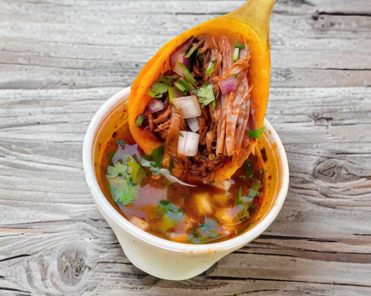 Consome de 237ml, incluye birria, cebollla, cilantro, limon, totopos. (La verdura va aparte)