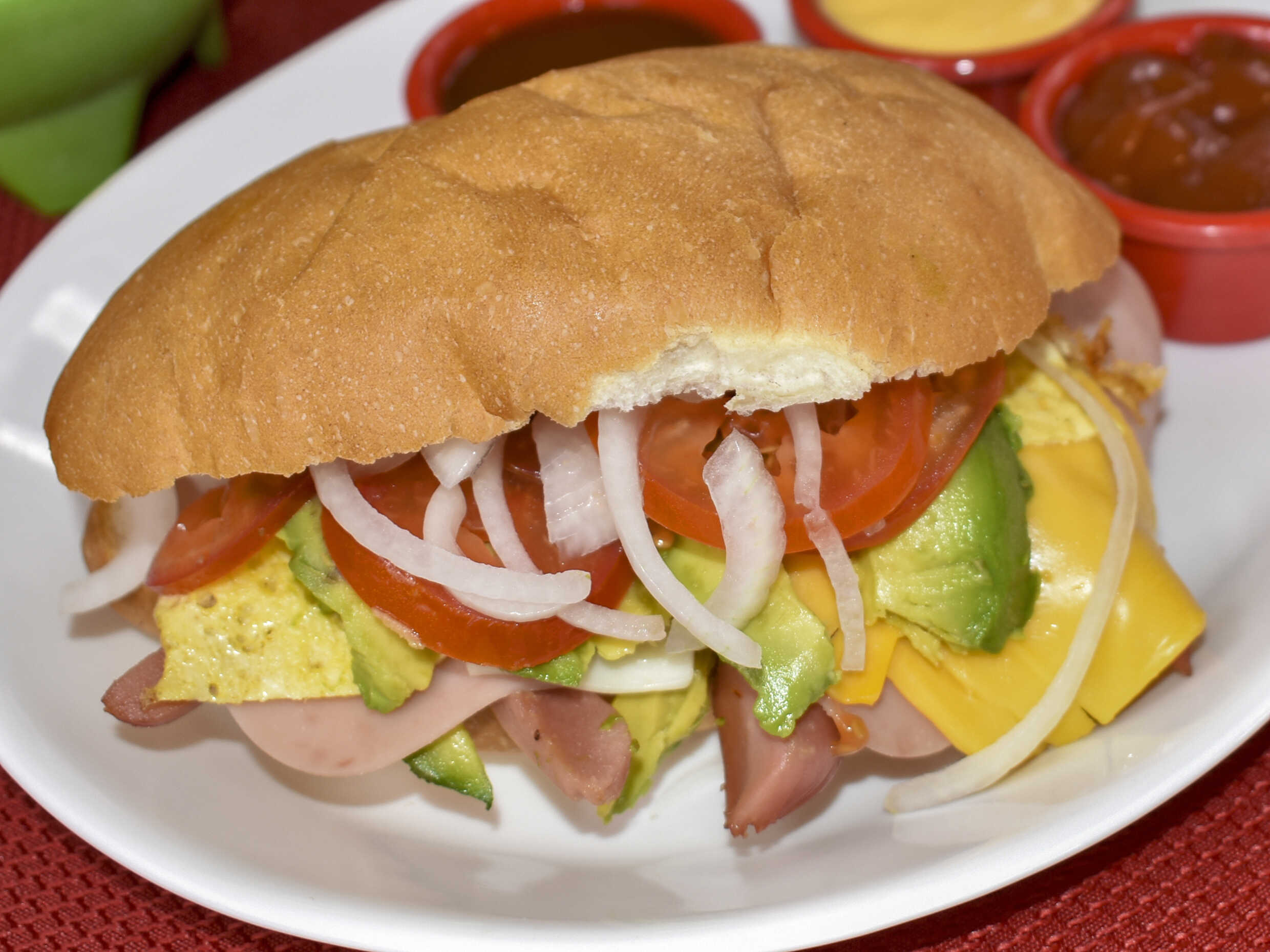 salchicha, jamon queso amarillo queso blanco huevo tomate cebolla y aguacate