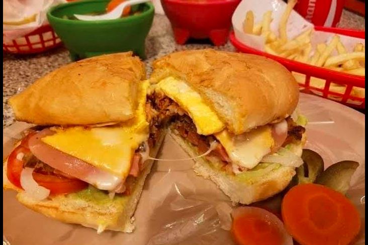milanesa queso blanco y jamón, tomate cebolla aguacate lechuga y frijolitos refritos