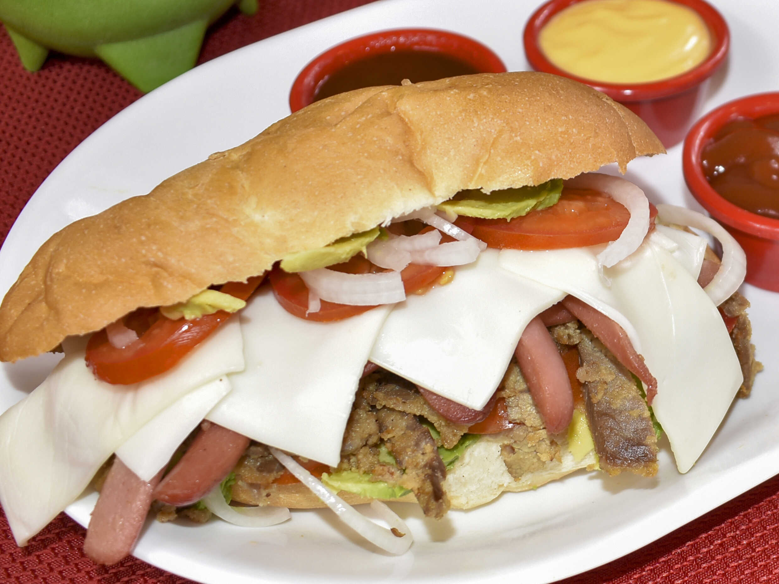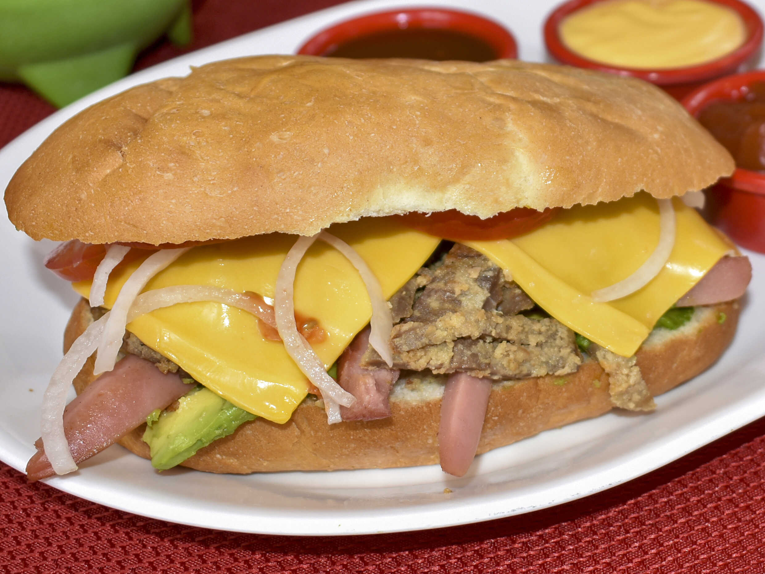milanesa, queso amarillo y salchica tomate cebolla aguacate lechuga y frijolitos refritos