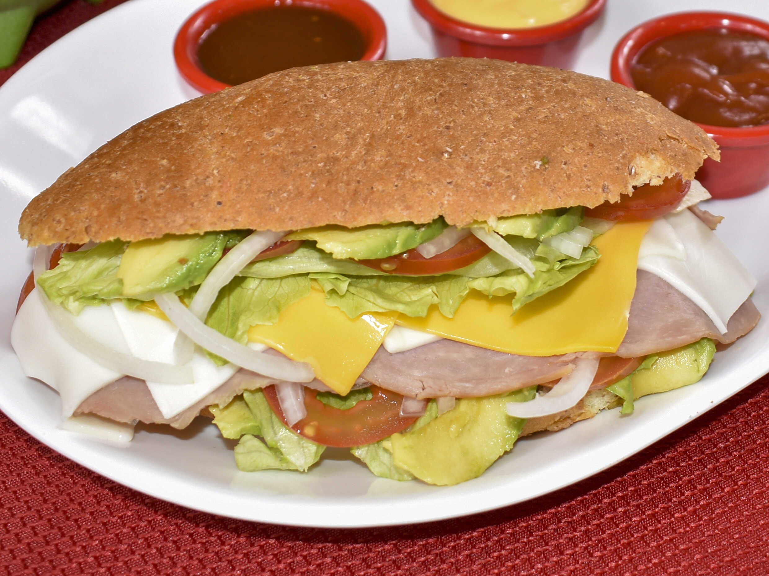 jamon ahumado queso amarillo queso blanco tomate cebolla aguacte lechuga