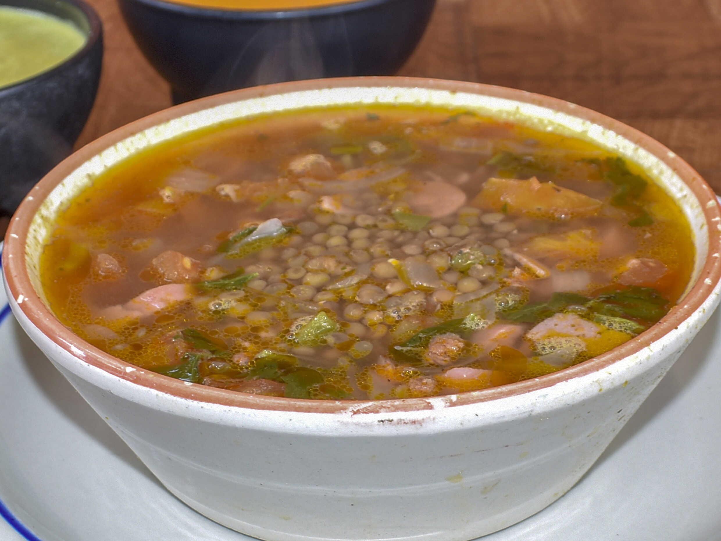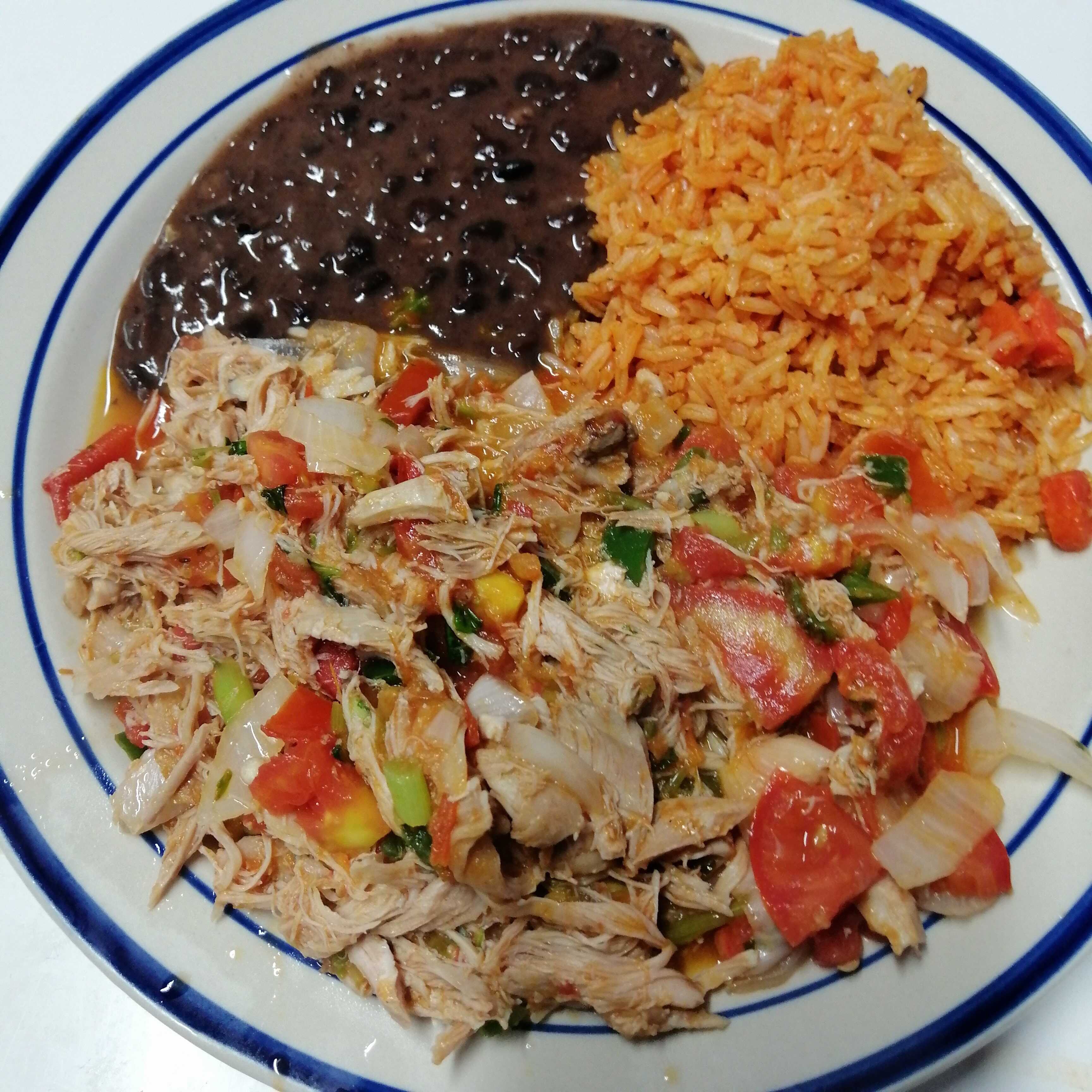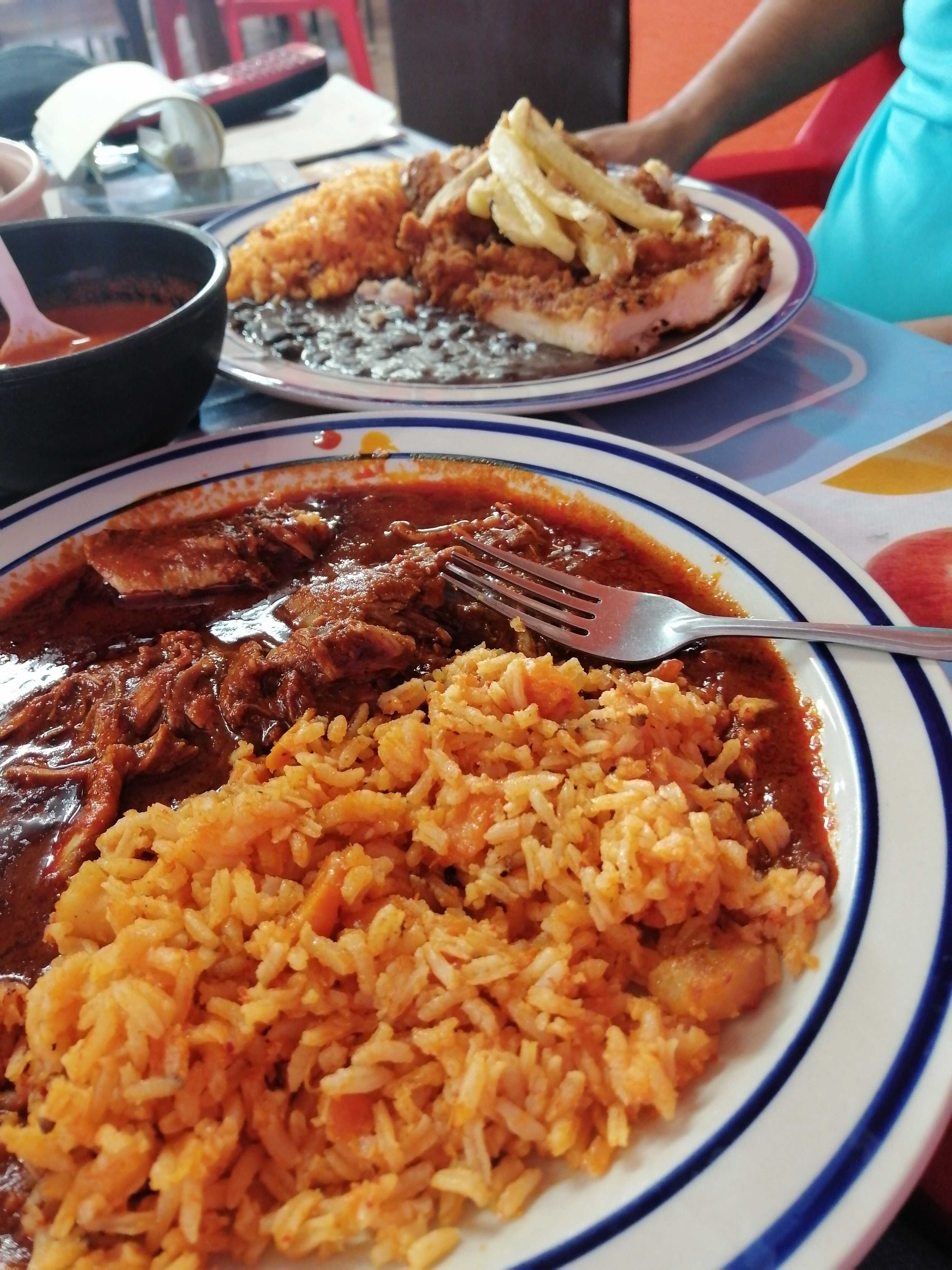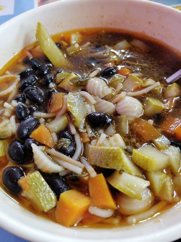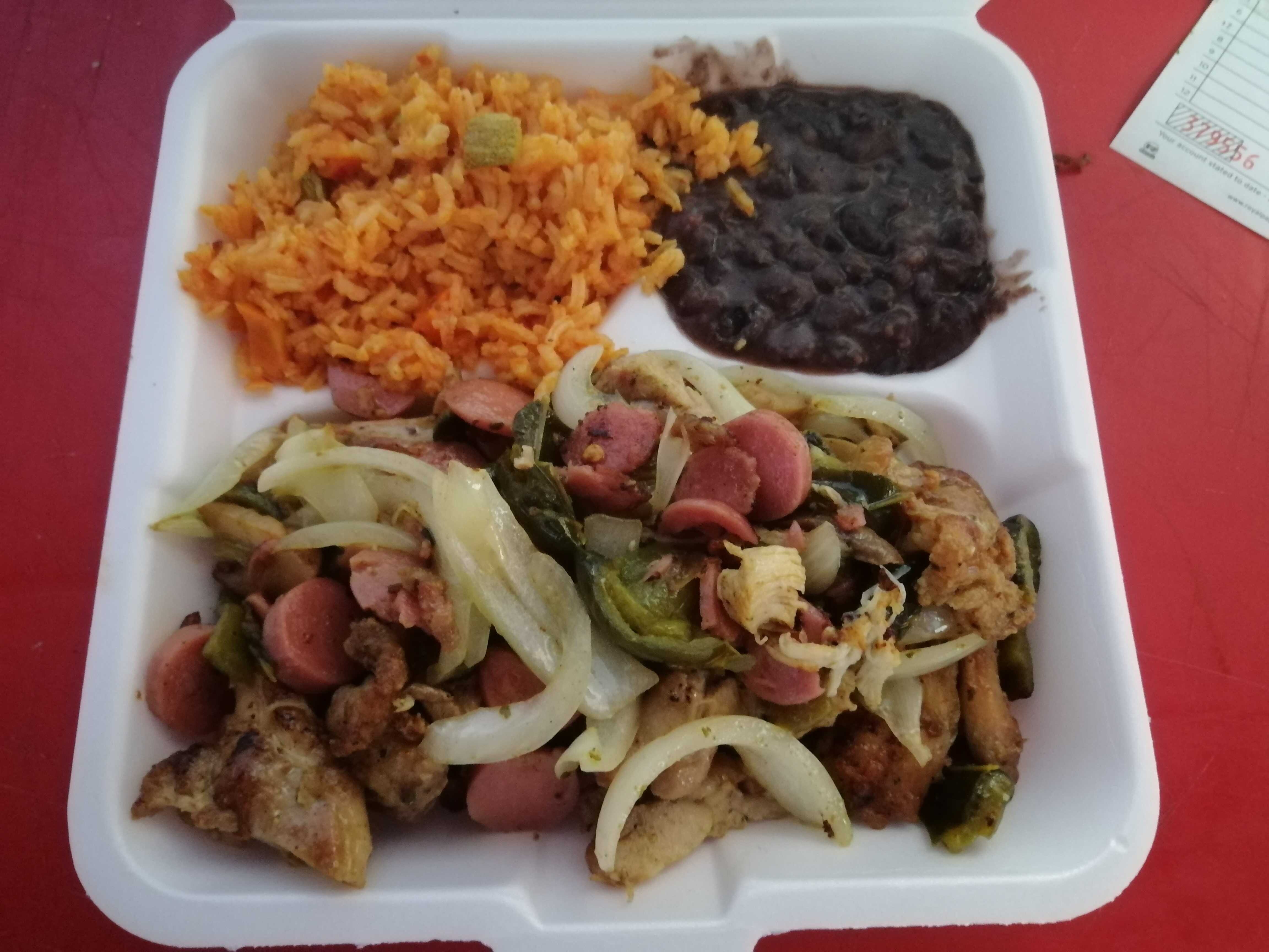 Arroz, frijoles, sopita de fideo de 4 oz, tortillas recién echas y agua de fruta natural.