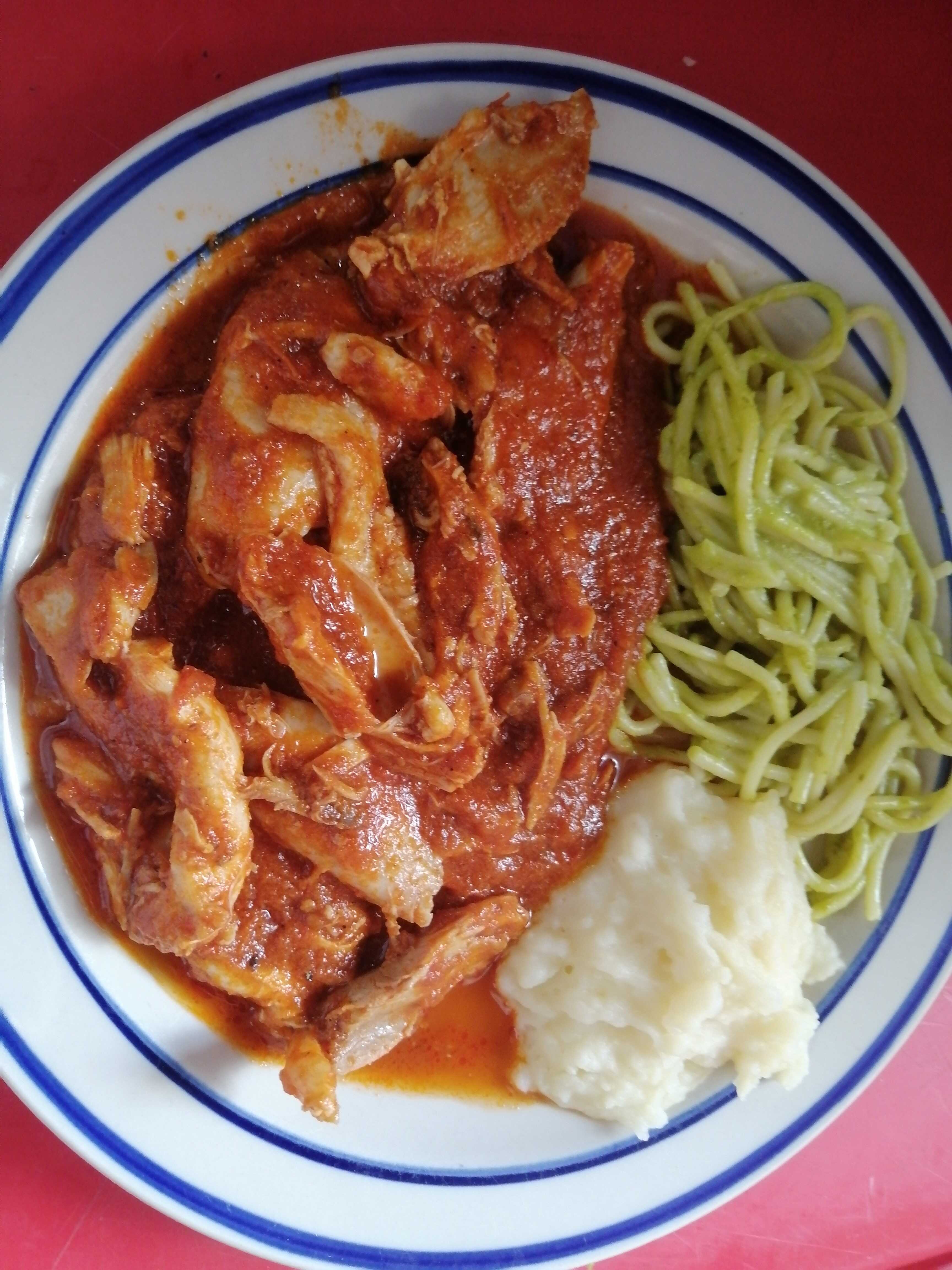 Pollo en Salsa Chipotle con Spaghetti y Puré