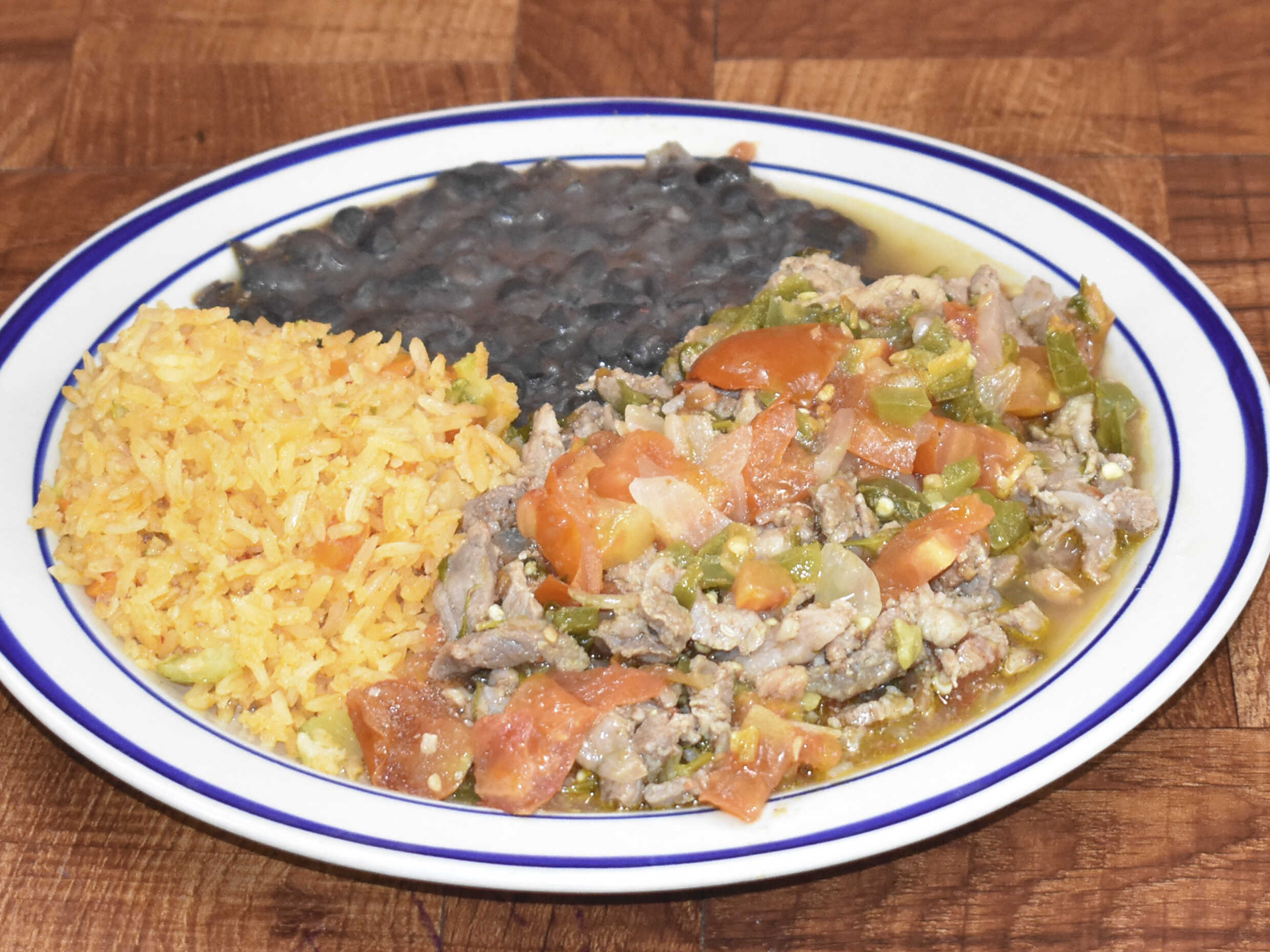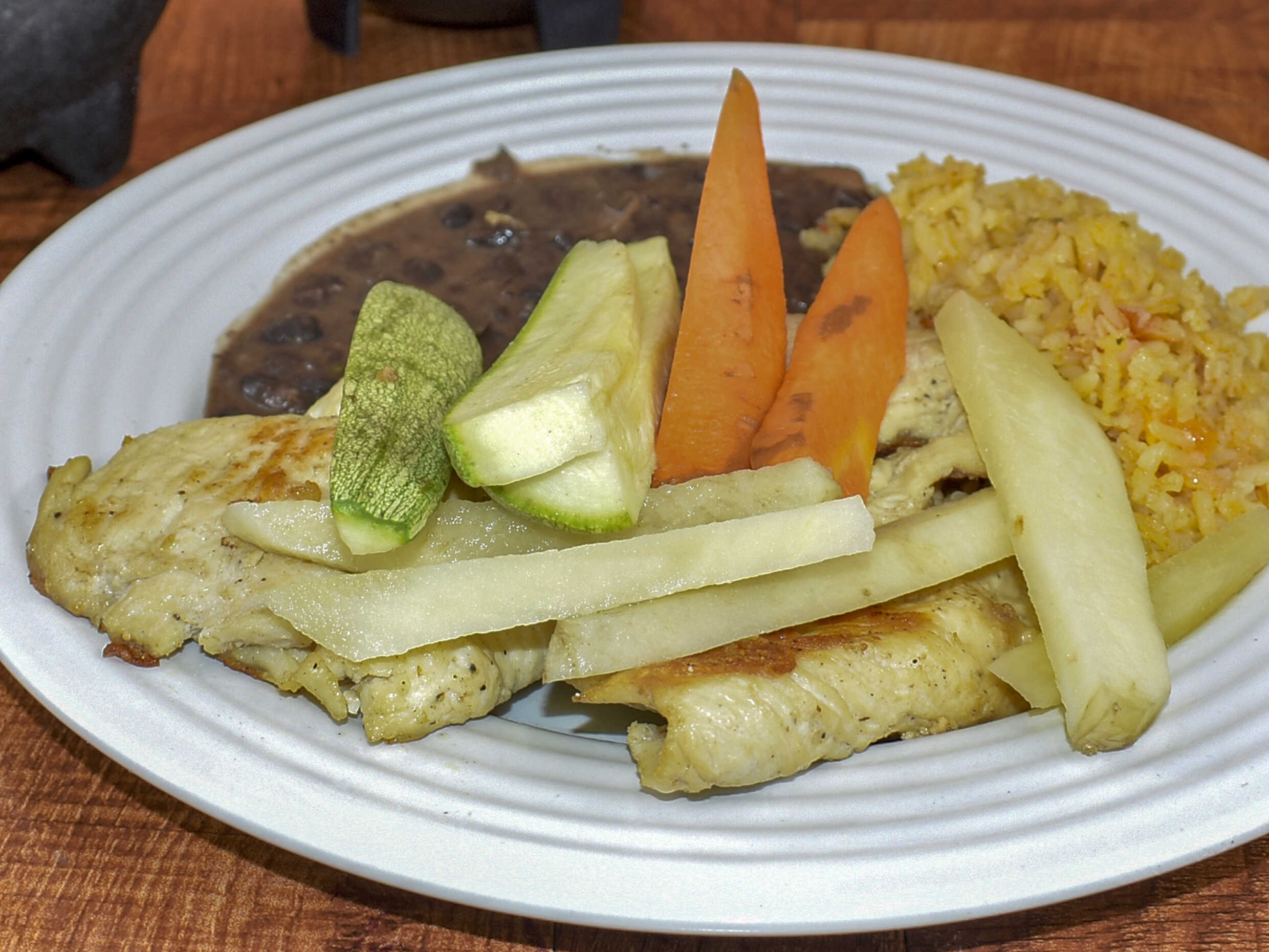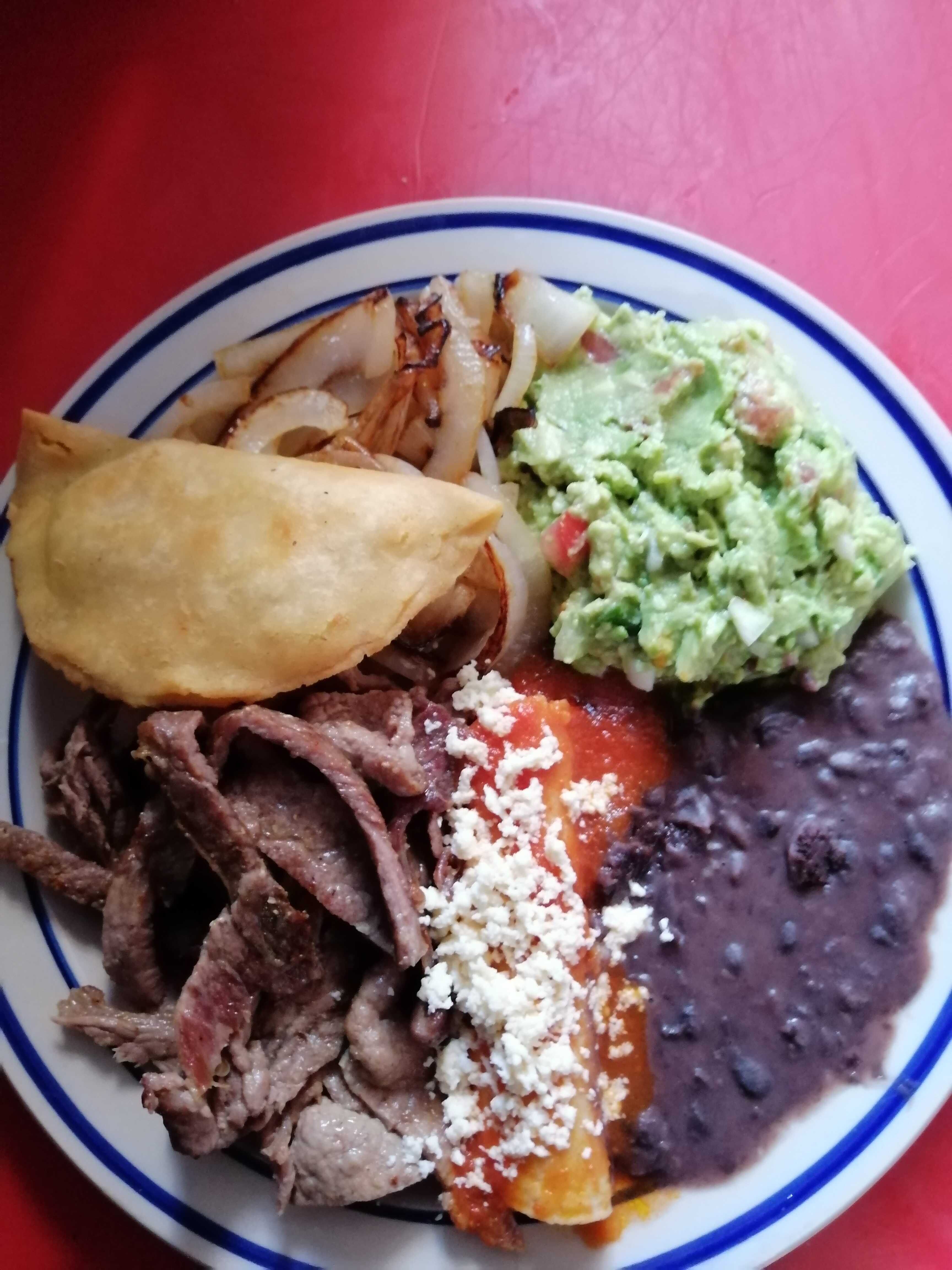 Incluye, frijoles, guacamole, cebolla asada, chile toreado, 1 quesadilla, 1 enchilada, tortillas y agua de fruta fresca.
