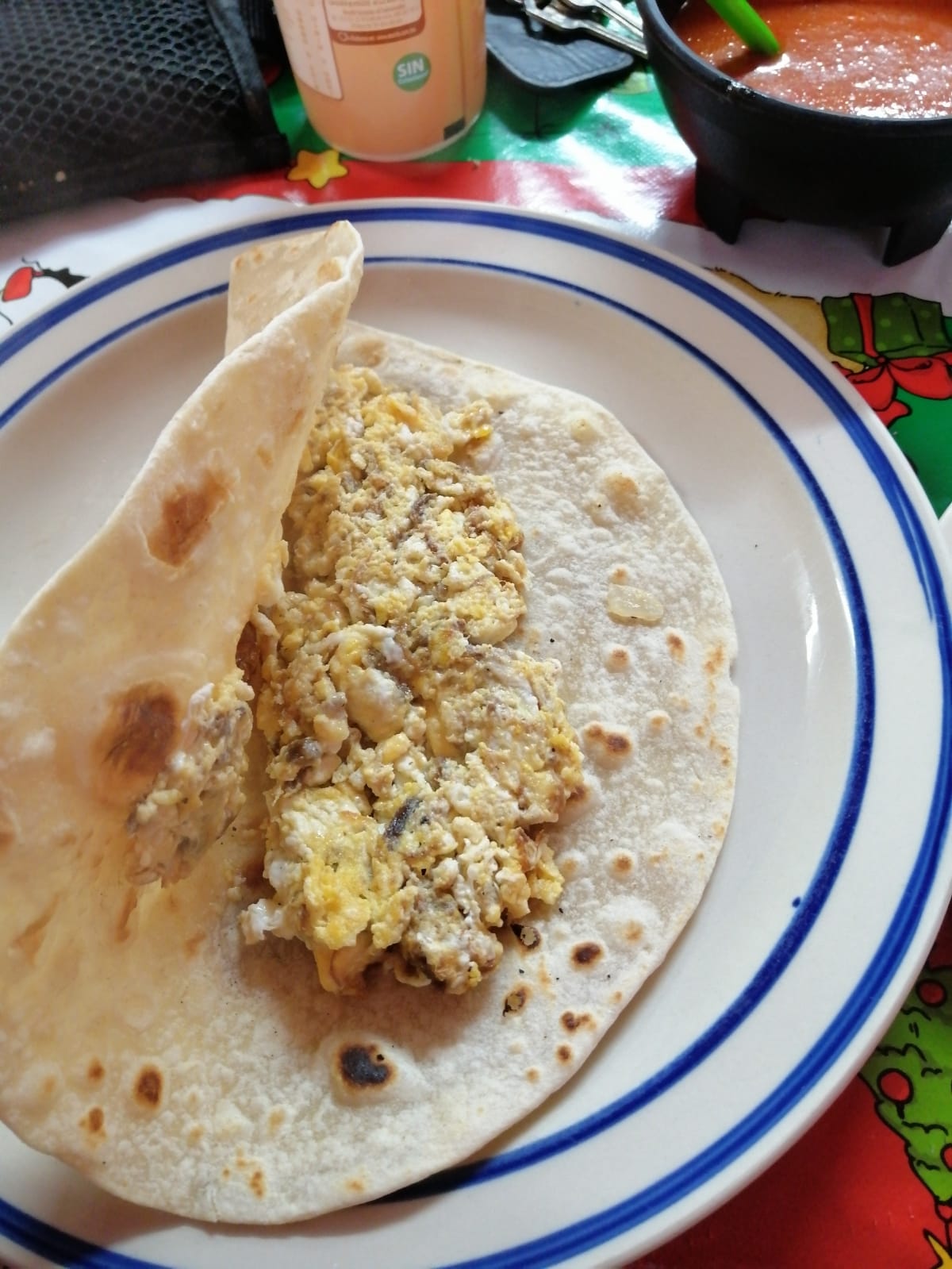 Tortilla de Harina de Huevo con Salsa Roja Picosa