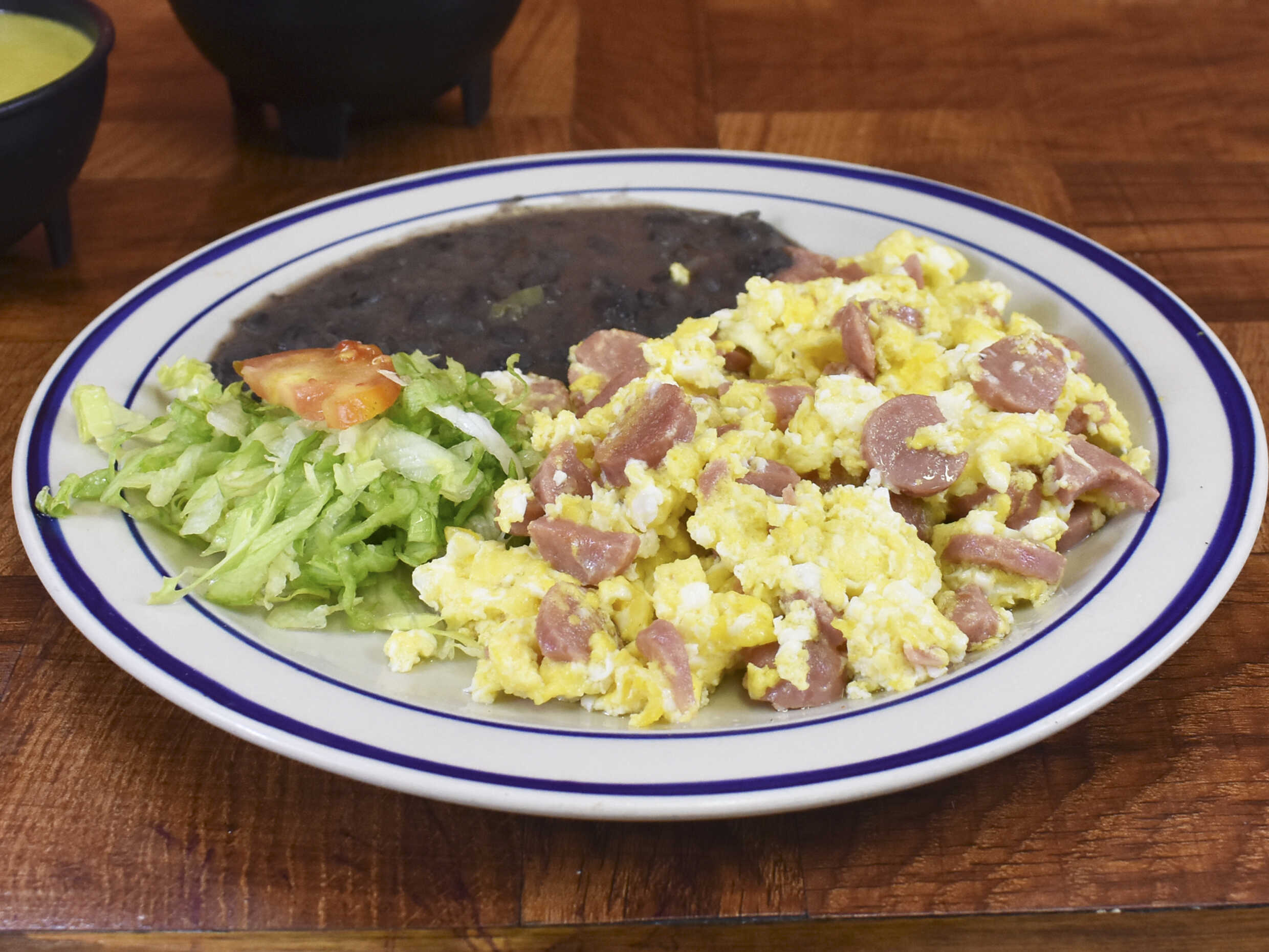 Jamón, salchicha, queso amarillo, lechuga, salsa ranchera y tort maíz.