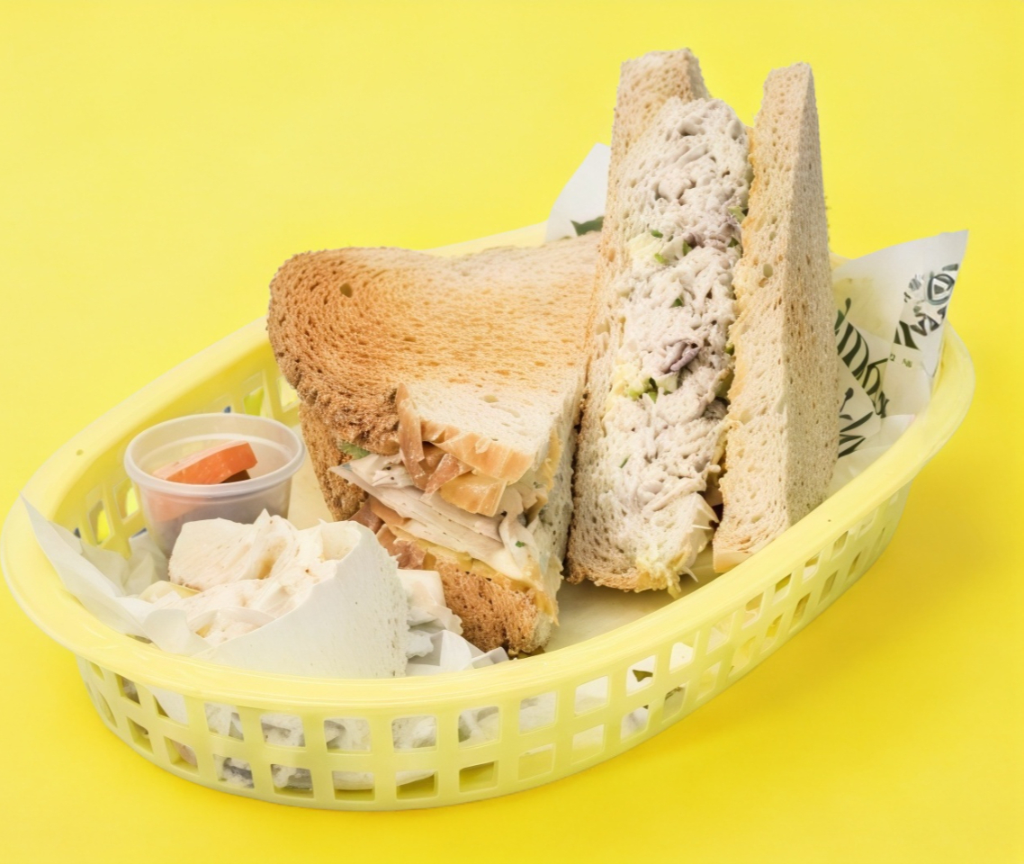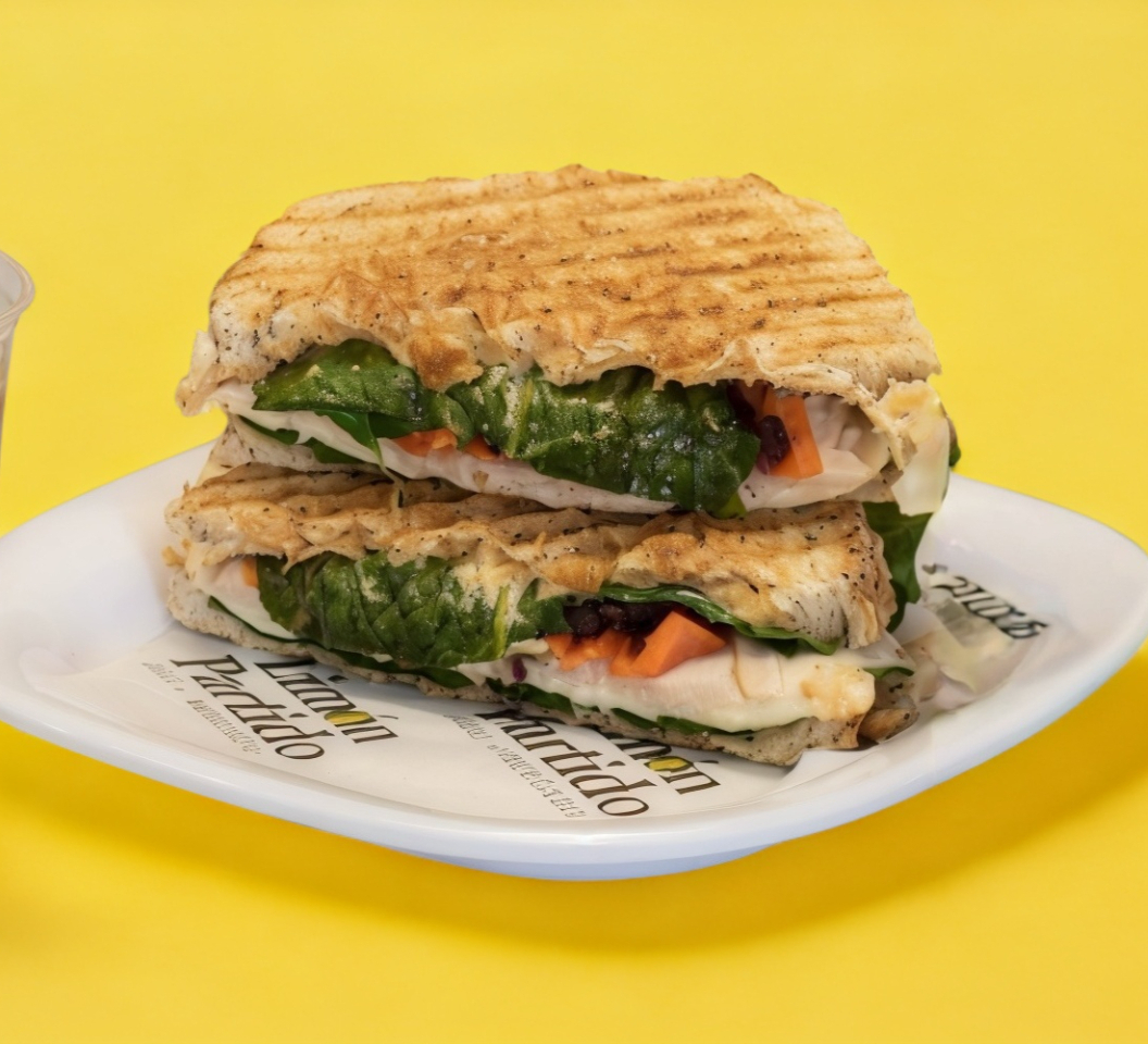 Pan tajado hecho en casa, aderezo de pimientos rojos, jamón de pechuga de pavo ahumado, queso panela, espinaca, zanahoria rallada y arándanos.