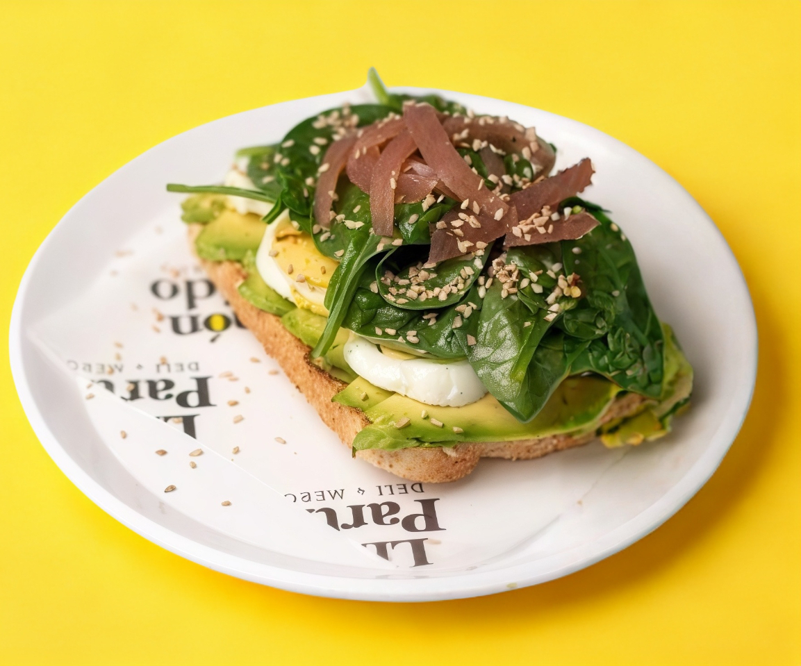 Pan tajado hecho en casa con cama de aguacate, espinaca con vinagreta tradicional, coronado con cebolla curtida, ajonjolí y huevo cocido.