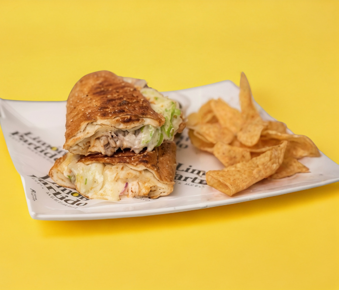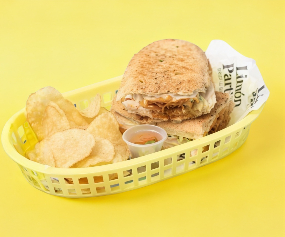 Baguette artesanal con carne deshebrada, queso chihuahua, lechuga picada, cebolla morada, pimientos rojos, mayonesa chipotle y crema.