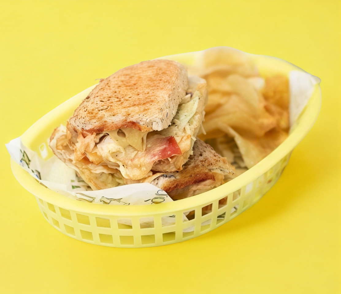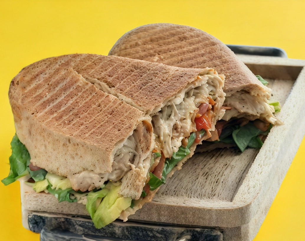 Baguette artesanal con pechuga de pollo a las finas hierbas, lechuga, tomate, queso chihuahua, mayonesa chipotle y aderezo de aguacate.