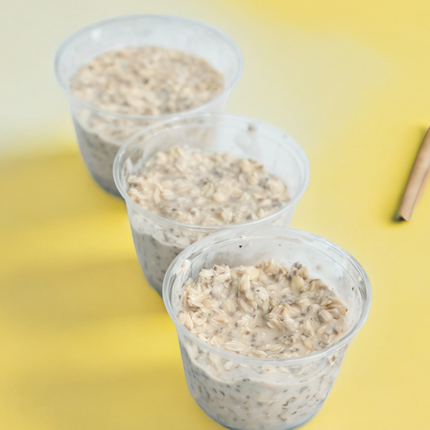 Avena reposada en leche de almendras, preparada con cama de plátano, miel y mix de super food.