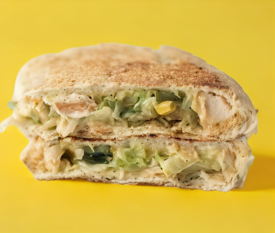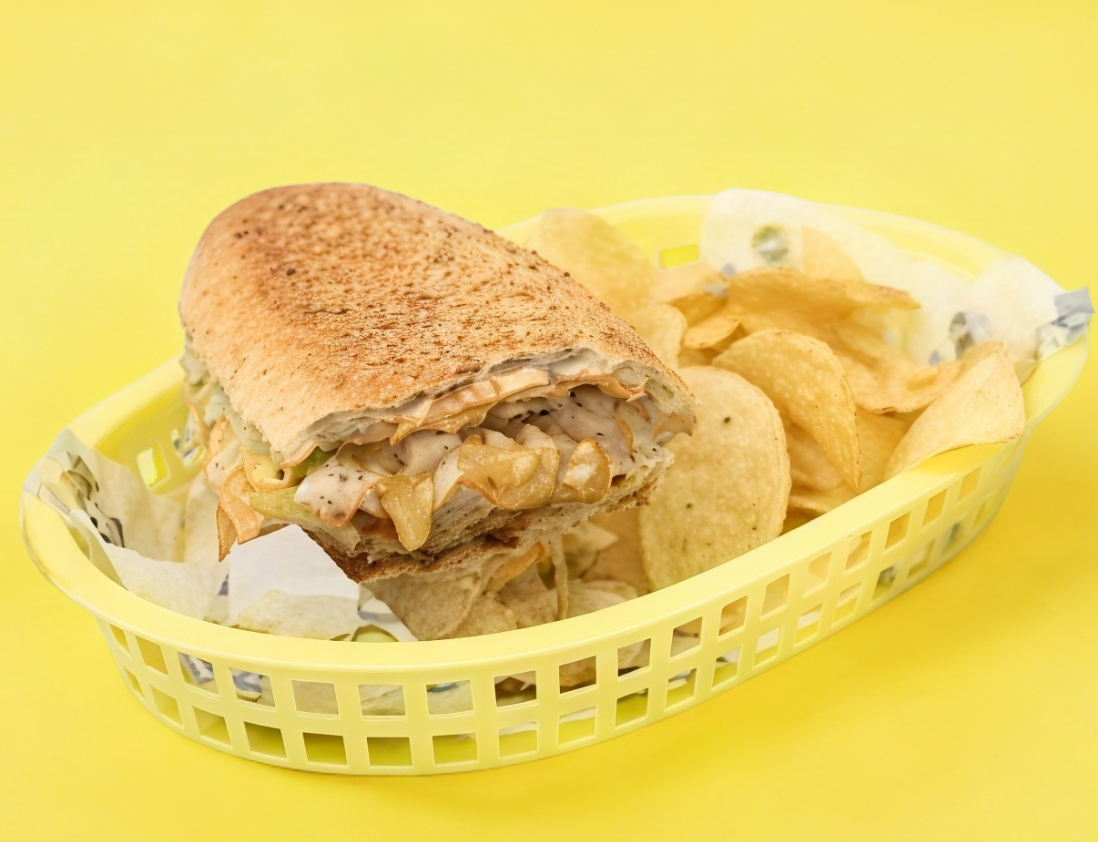 Baguette artesanal con pechuga de pollo a las finas hierbas, rajas poblanas en crema, elote lechuga picada, queso chihuahua y mayonesa chipotle.