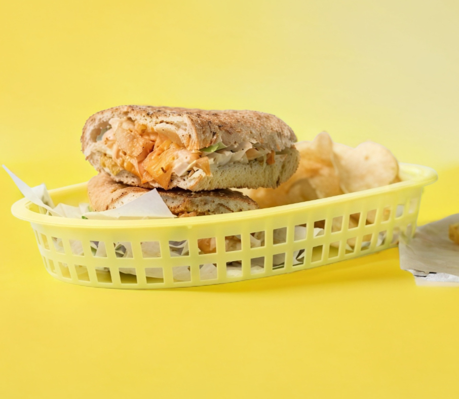 Baguette artesanal con pechuga de pollo al buffalo, mayostaza,salsa buffalo, aderezo ranch, zanahoria rallada, lechuga,queso chihuahua.