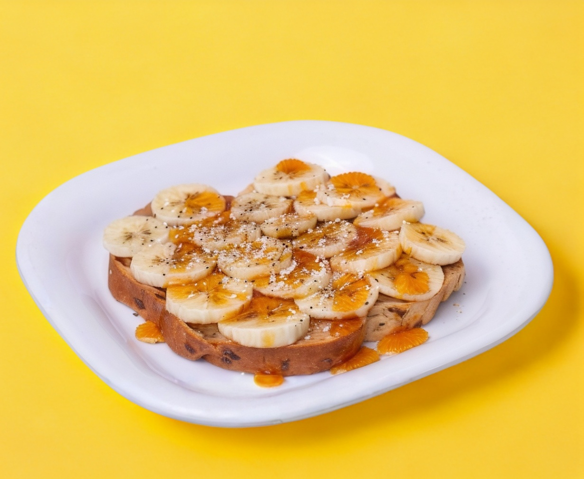 Pan tajado hecho en casa tostado, con mantequilla de almendras, cama de rodajas de platano con miel y mix de superfood (linaza,amaranto,chia).