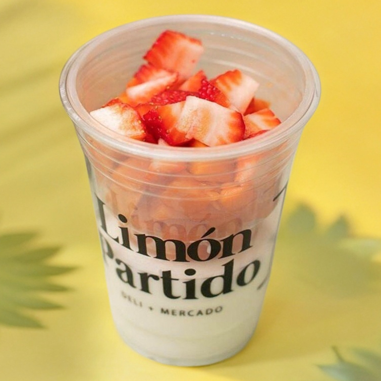 Base leche de almendras con fresas, yogurt, avena, endulzado con miel orgánica.
