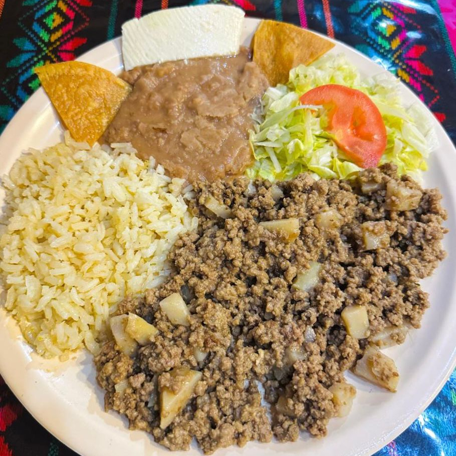 PICADILLO DE RES ACOMPAÑADO DE ARROZ, FRIJOLES Y VERDURA