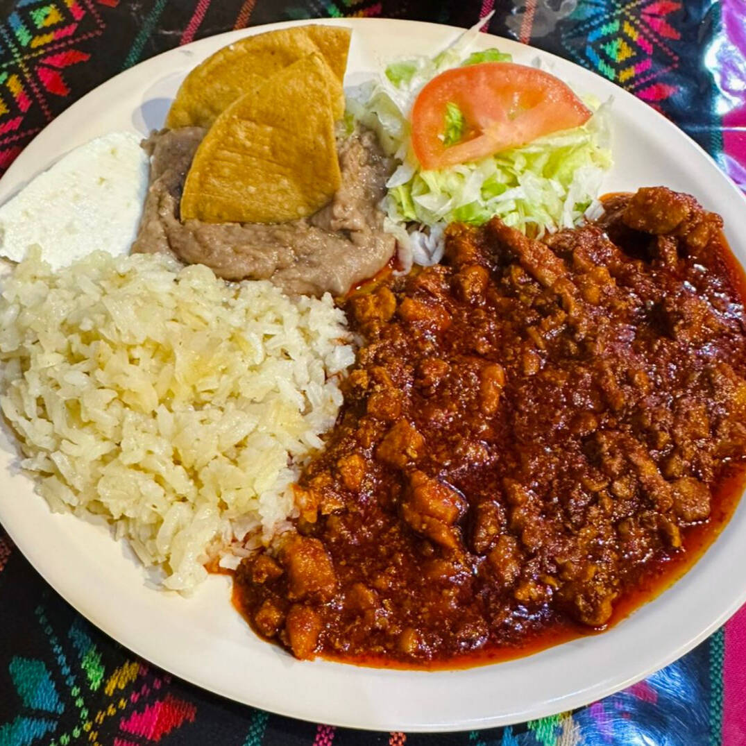4 ENCHILADAS ROJAS , RELLENAS DE CARNE DESHEBRADA DE RES ACOMPAÑADA DE PAPITAS CON ZANAHORIA Y VERDURA