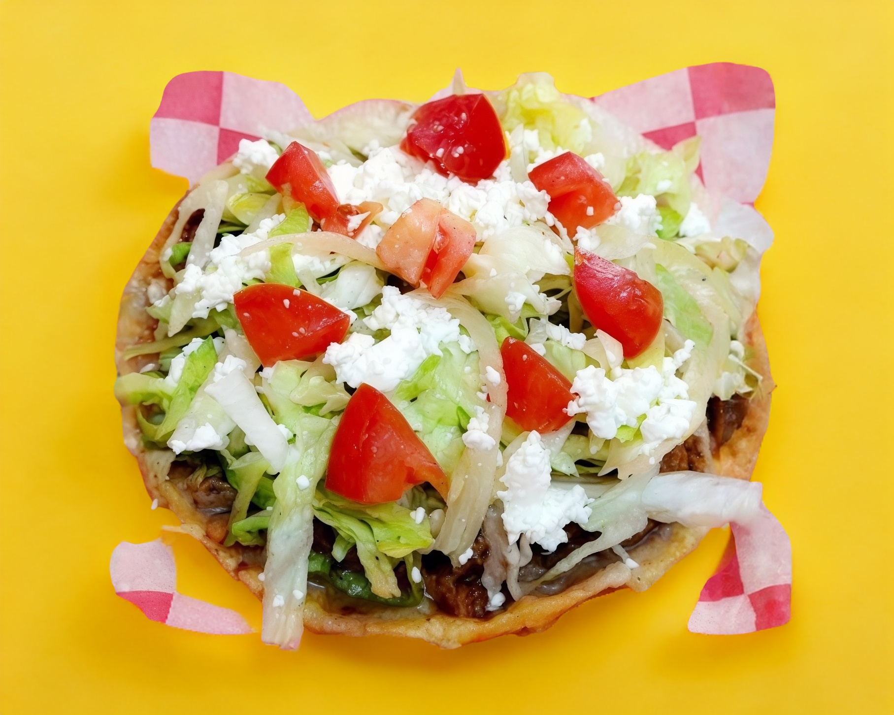 Lleva frijoles, guiso a escoger, lechuga, tomate y queso, acompañado con crema.