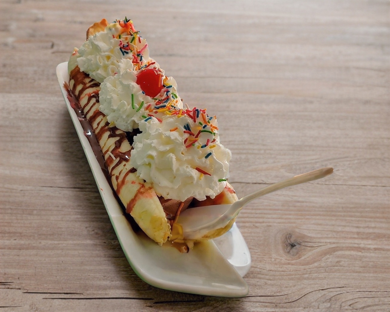 Bananasplit con 3 porciones de nieve, jarabe de chocolate, fresa, galletas y mas..
