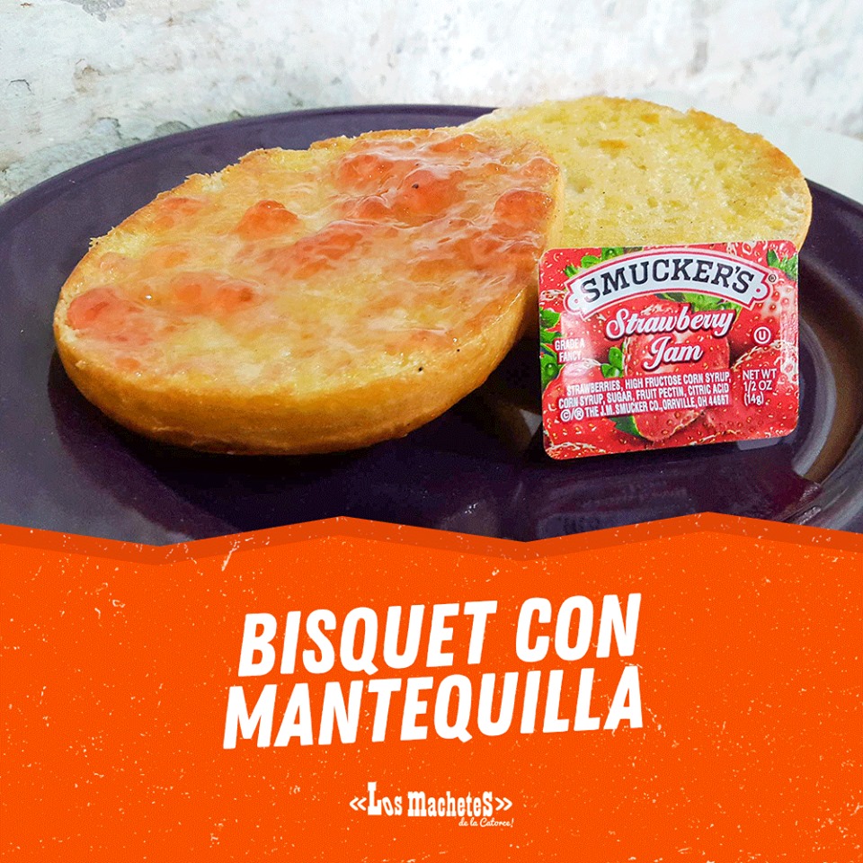 Machete de 40 cm con huevo al gusto (un ingrediente), un guisado, incluye queso y frijoles.