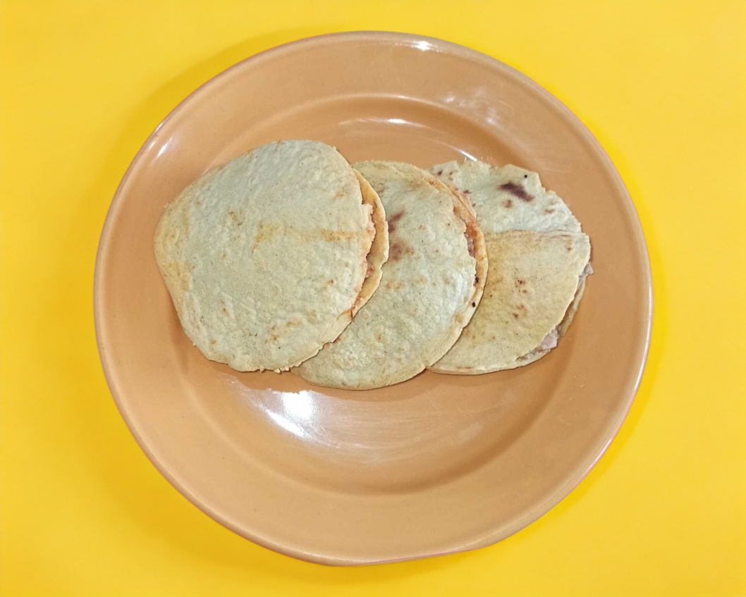Migada de maiz hecha a mano, con un guiso, frijoles, queso fresco, aguacate, lechuga y tomate (a petición del cliente).