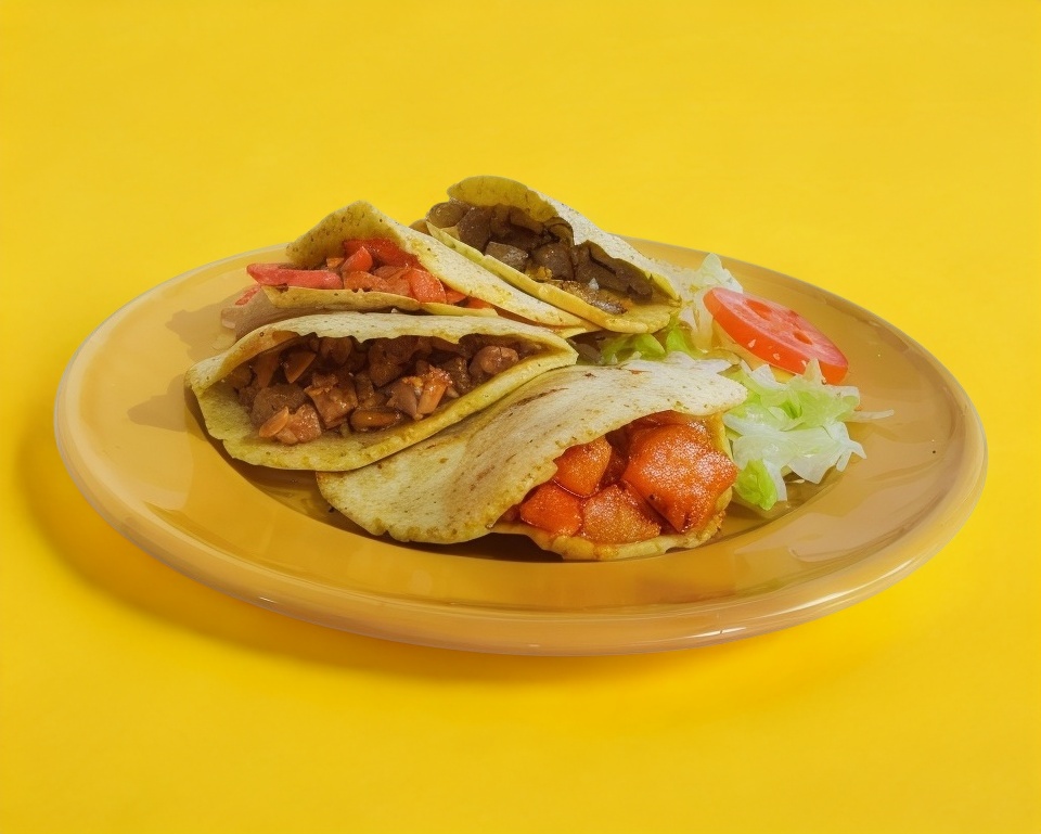 3 Tacos de maíz rellenos con huevo revuelto, bañados con frijoles, chorizo, queso fresco y cebollitas con chiles marinados.