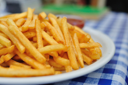 Hamburguesa de pechuga de pollo, papas y refresco.