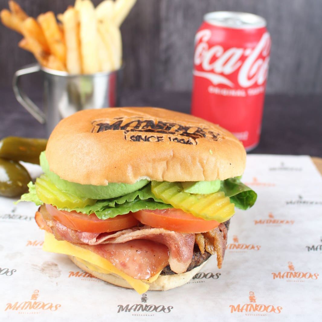 Hamburguesa mandos, jamón, tocino, porción de papas y refresco.