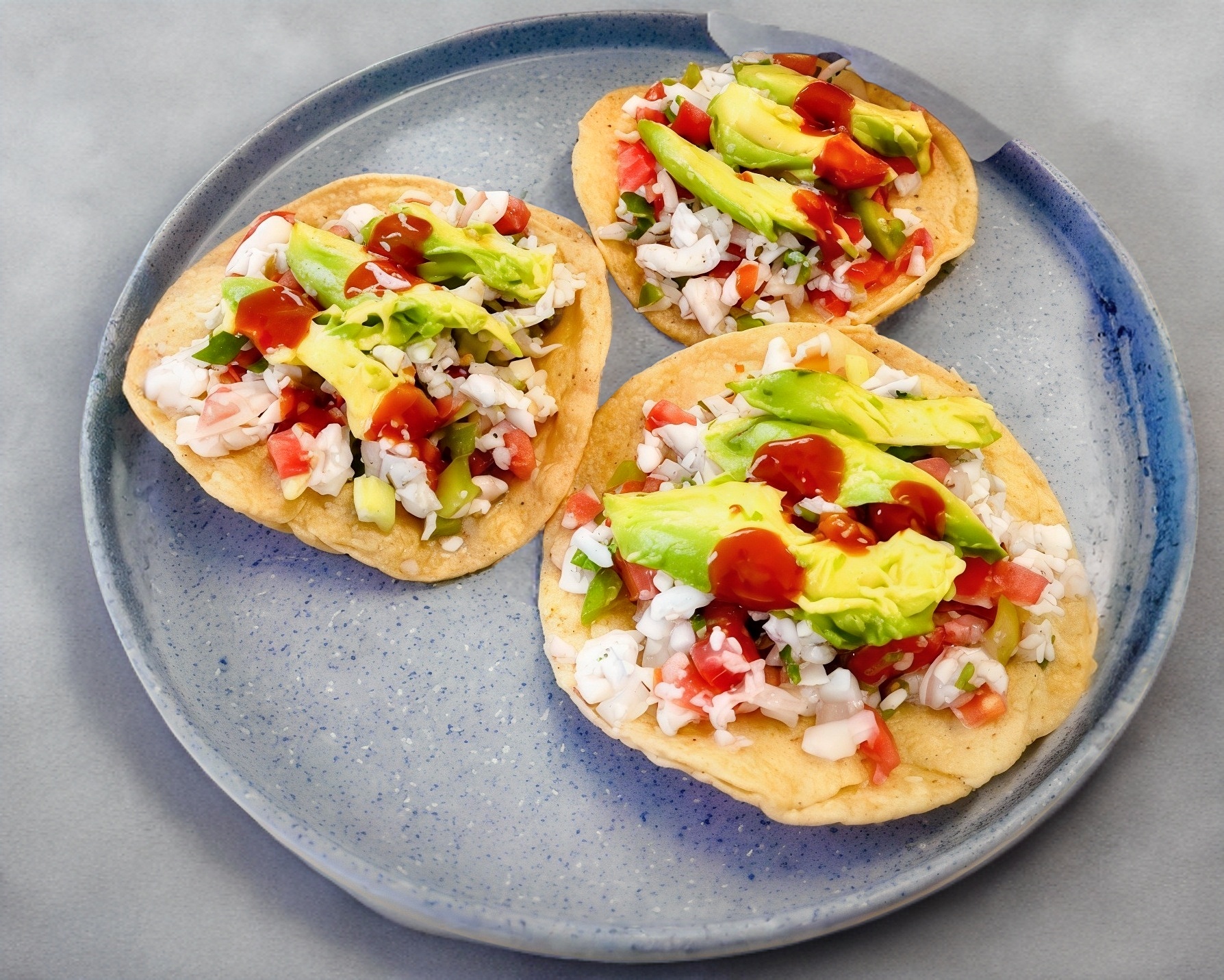 3 PIEZAS DE TOSTADAS, ACOMPAÑADAS DE SU PORCION DE CAMARON, PICO DE GALLO Y AGUACATE